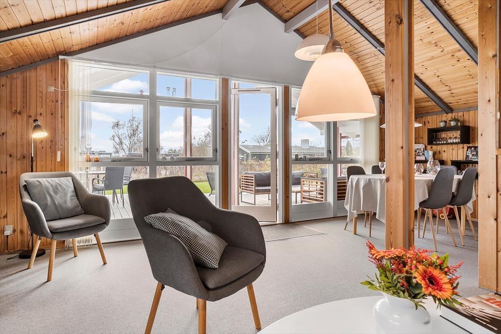 Fra fordelingsgangen går man videre ind i husets samlingsrum; det dejlige, åbne køkken/alrum og stue. De store vinduer giver et godt lysindfald og udsyn til haven, hvilket fremhæves af loftet der er til kip. Samtidig er trævæggene bevaret, så der er en hyggelig sommerhusstemning, hvor hele familien kan samles.