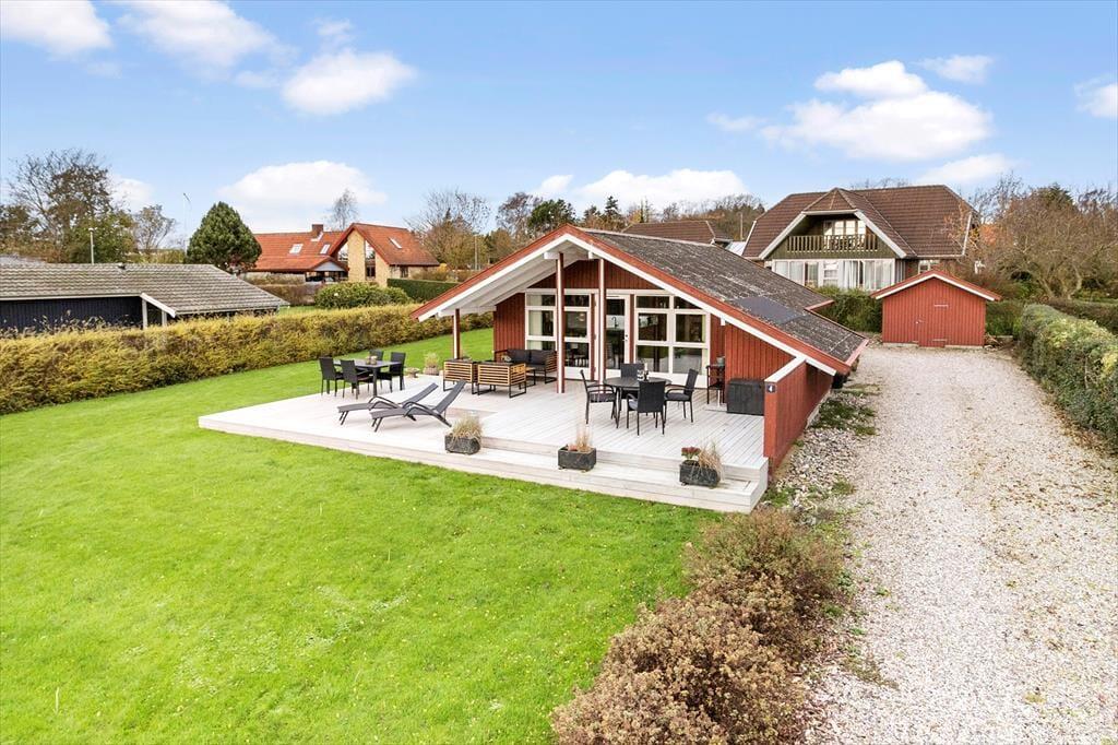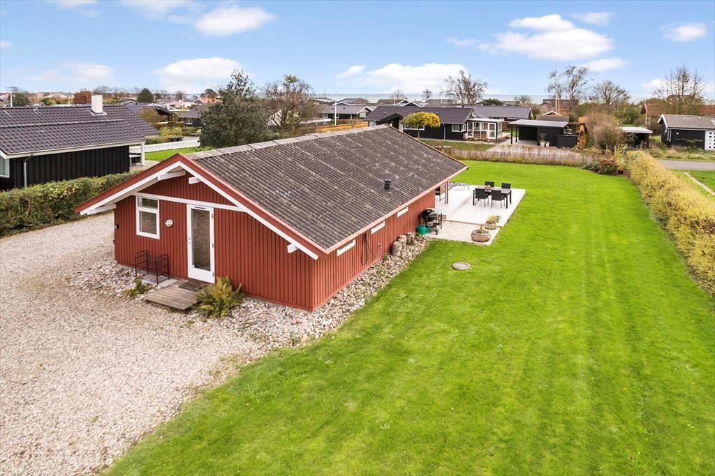 Haven, der omkranser sommerhuset, er stor og med sol hele dagen. Den åbne plæne er med plads til leg og boldspil, og samtidig er grunden omkranset af buske og hæk. På grunden er der en god indkørsel og plads til at parkere. Vendt væk fra vejen, ved entredøren er en lille terrasse med et bålfad, der med fordel kan tændes op i, når mørket sænker sig, og hyggen skal i top.