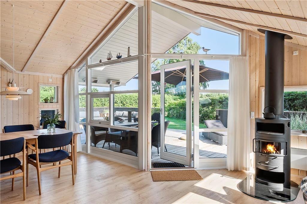 Sommerhuset opvarmes med brændeovn, varmepumpe og elvarme.