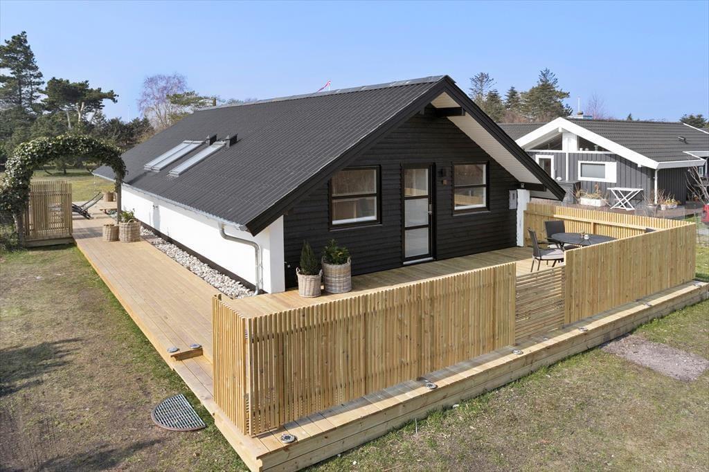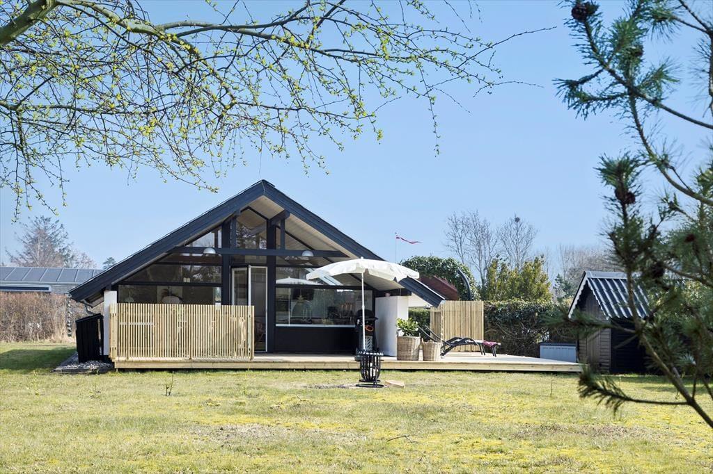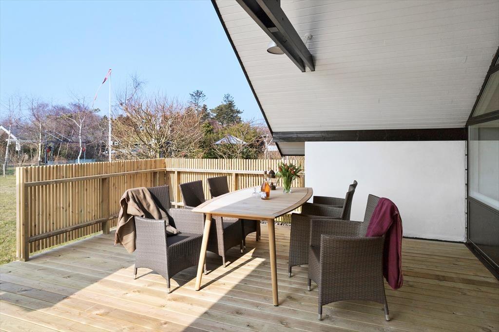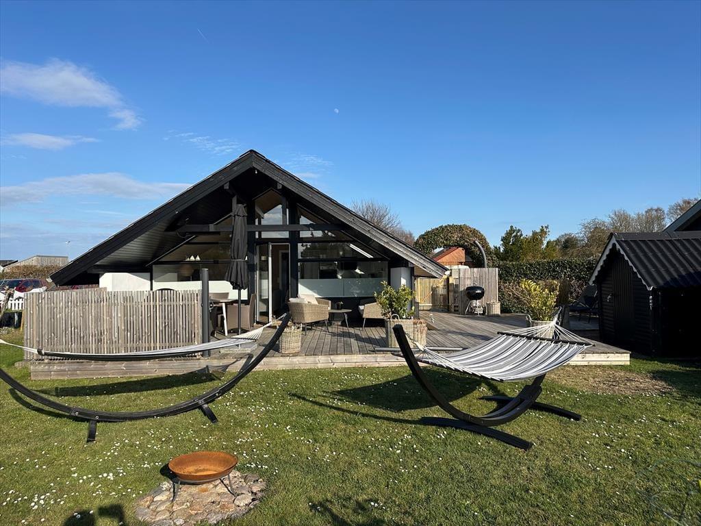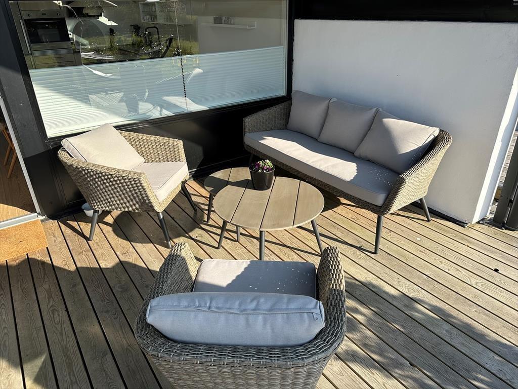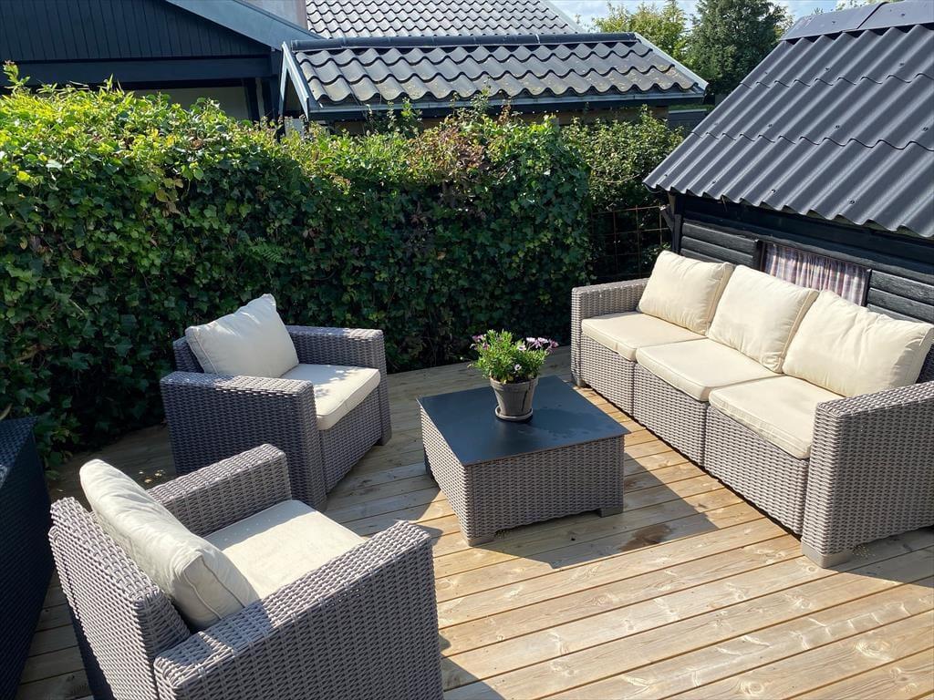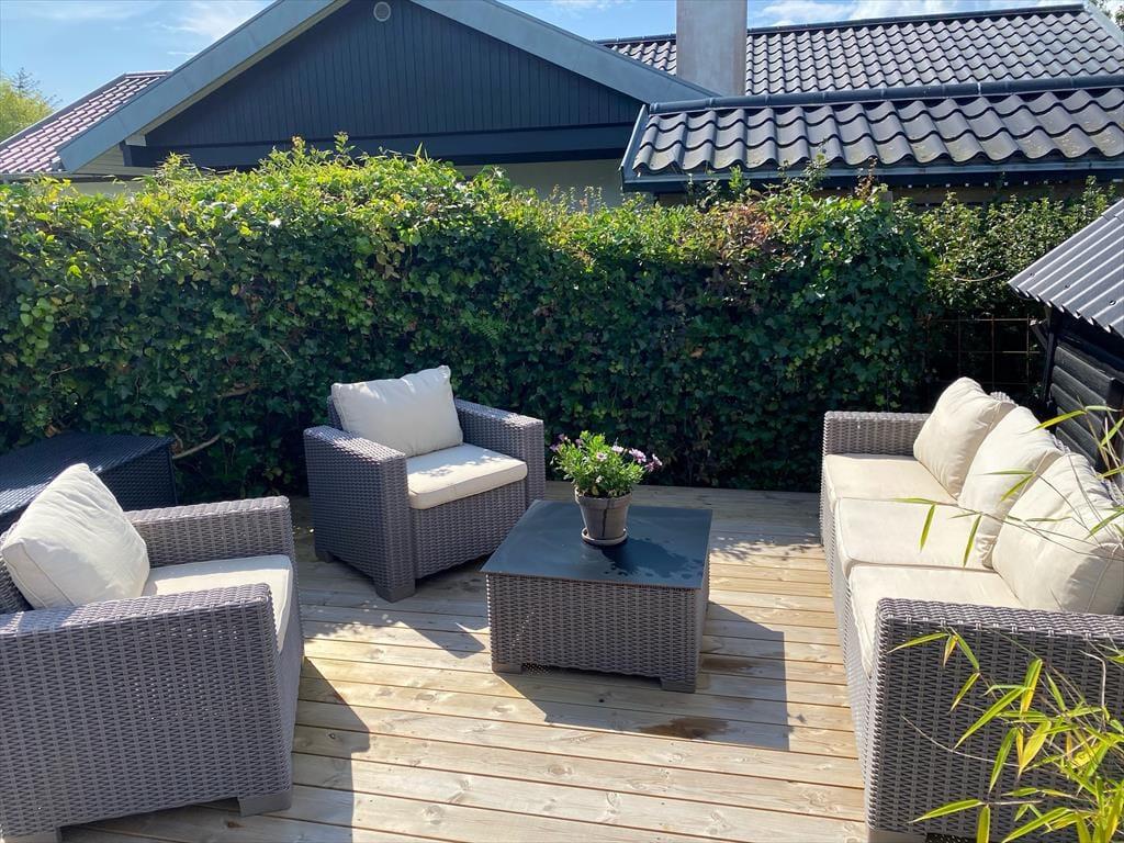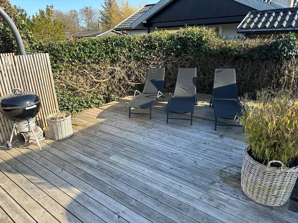 I får mange muligheder for at nyde udelivet ved huset. På husets store træ terrasser kan I nyde solen hele dagen i de fine havemøbler og liggestole. Der kan altid findes et sted, hvor der er læ og mon ikke en del af opholdets måltider vil blive tilberedt på huset grill eller I vil lave snobrød over bålstedet.