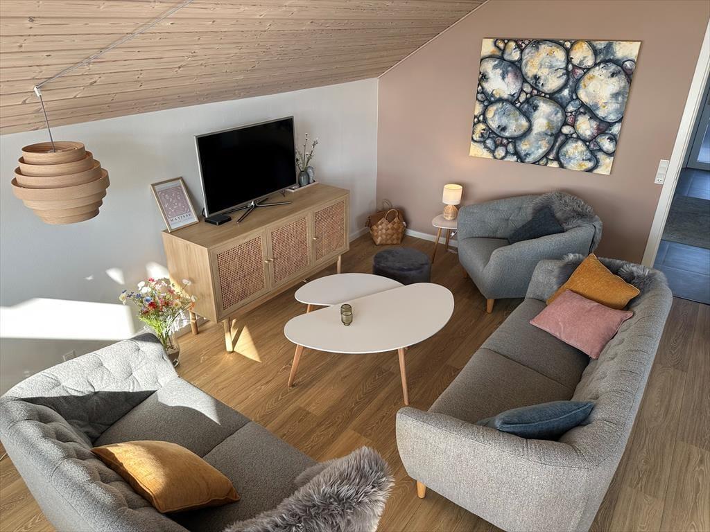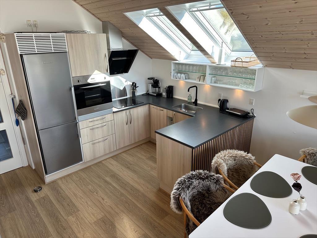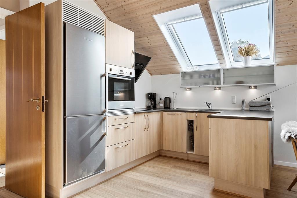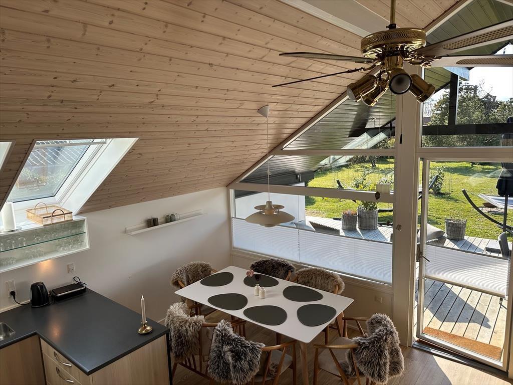 Det er et åbent køkken, hvor I finder alt hvad I skal bruge under jeres ophold og med direkte adgang til god spiseplads og fin stue. Når vejret er til ”inde-hygge” er der sofagruppe med TV, der har danske, tyske, svenske og norske kanaler samt Chromecast. Der er gratis internet i huset – hastighed 50/50. Rummet her er oplagt til I kan samles, nyde tiden, hinanden, spille brætspil og slappe af.