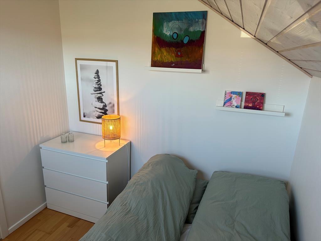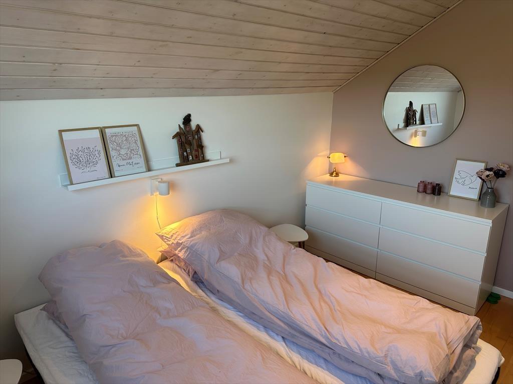 Sovepladserne i huset er fordelt på tre soverum alle med gode dobbeltsenge. Huset moderne badeværelse er med toilet, brus og gulvvarme.