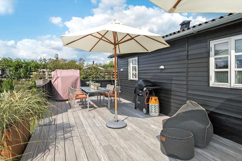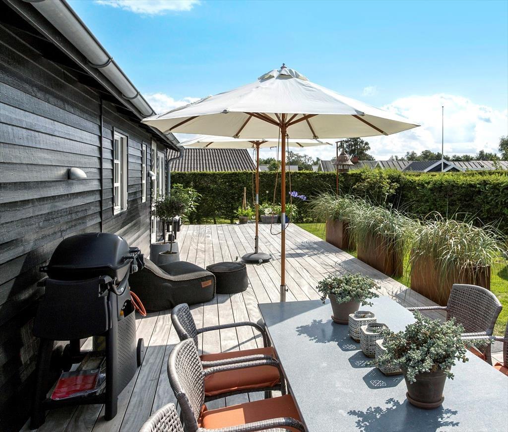 I får mange muligheder for at nyde udelivet ved huset. På husets store træterrasser kan I nyde solen hele dagen i de fine havemøbler. En af terrasserne er overdækket. Der kan altid findes et sted, hvor der er læ og mon ikke en del af opholdets måltider vil blive tilberedt på huset grill.