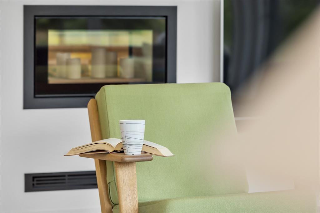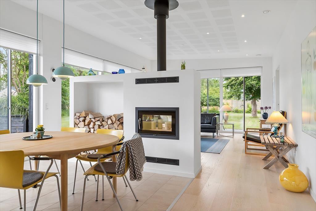 Stue og køkken-alrummet er arkitektonisk smukt opdelt af en halvmur med indbyttet pejs. Denne pejs kan benyttes med stearinlys, der må ikke tændes op i pejsen. Du skal dog ikke frygte for at komme til at fryse, for hele huset har gulvvarme, så dine føder bliver ikke kolde i dette feriehus.