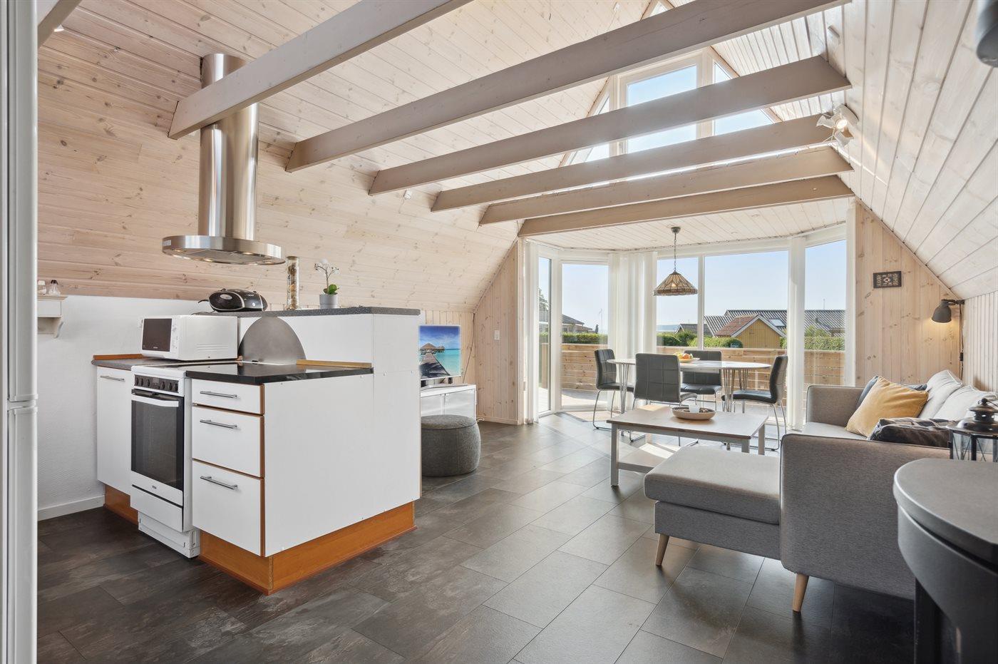 Køkkenet er udstyret med 1 køleskab. Der er 4 induktionskogeplader, bageovn, mikrobølgeovn samt opvaskemaskine.