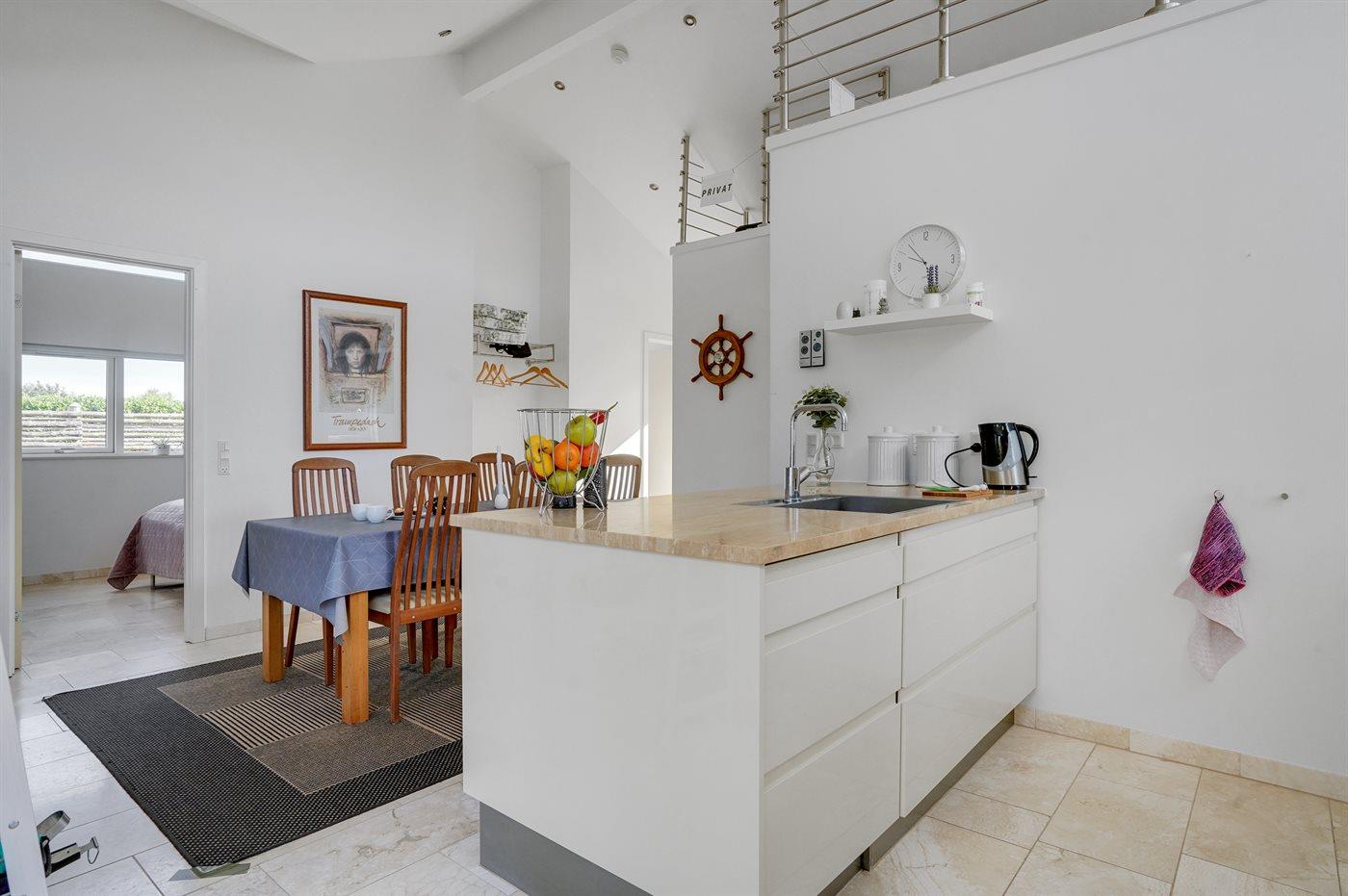 Køkkenet er udstyret med 1 køleskab. Der er 4 keramiske kogeplader, varmluftovn, mikrobølgeovn samt opvaskemaskine.