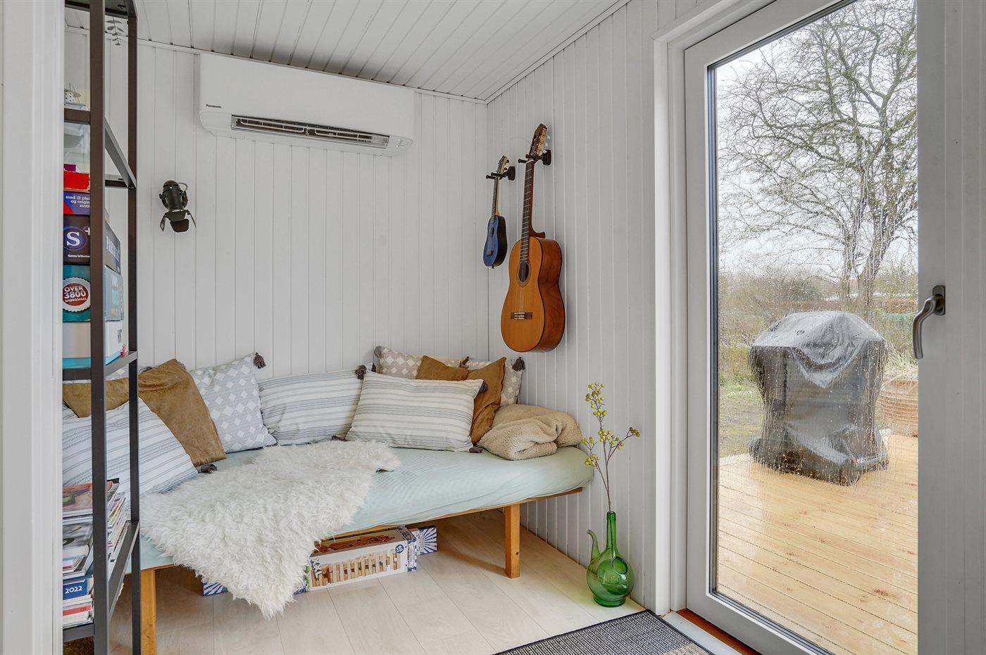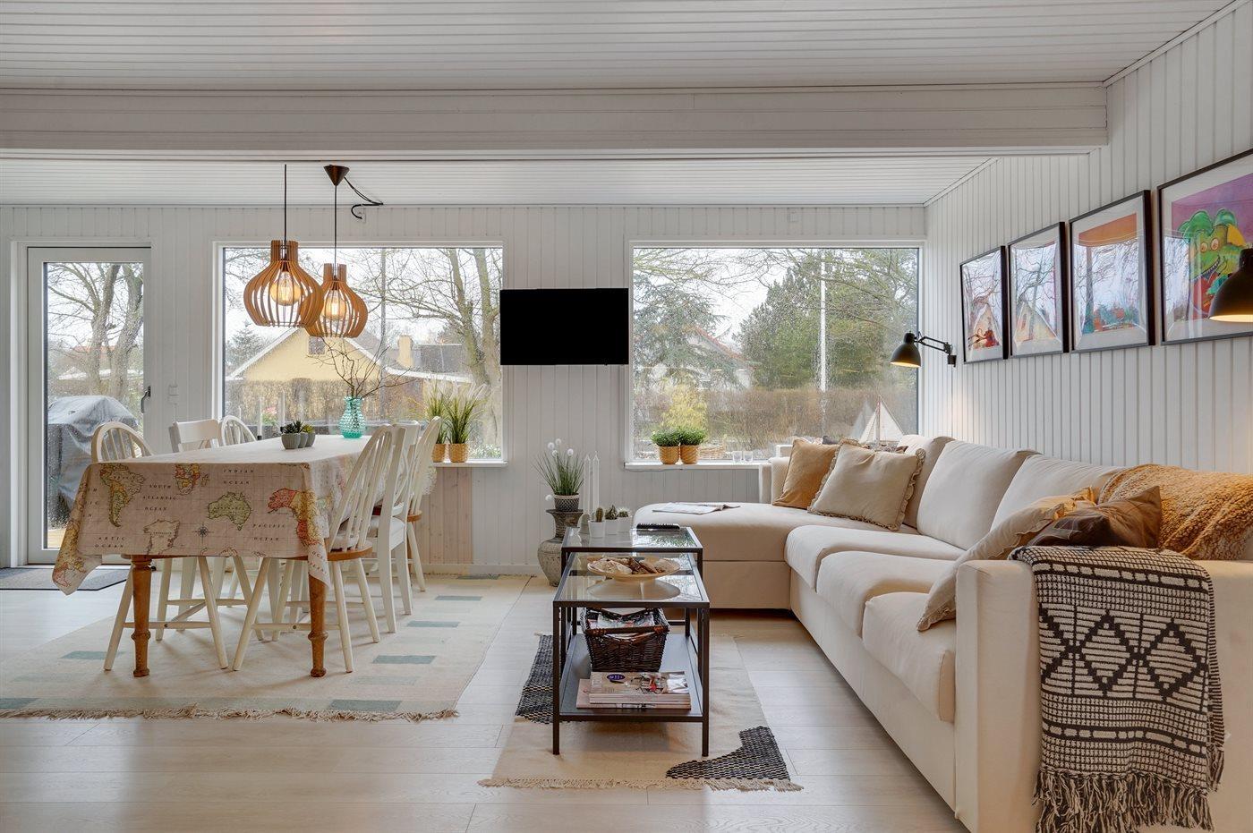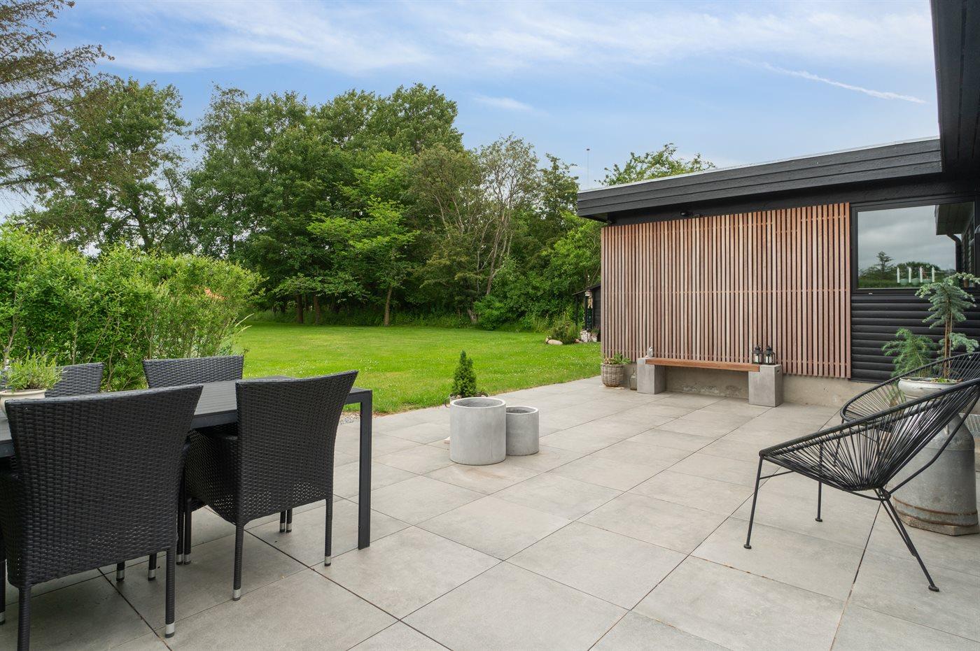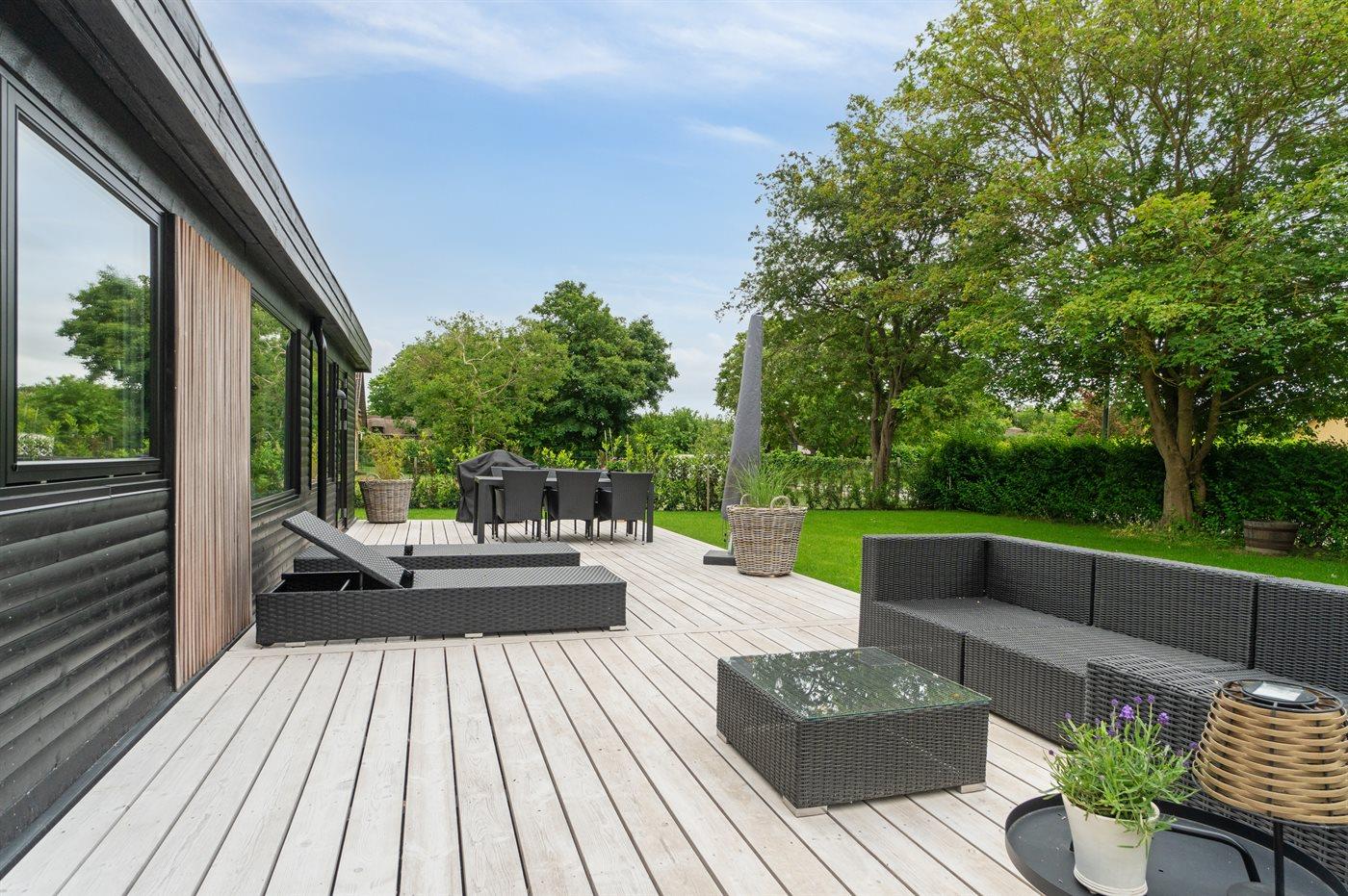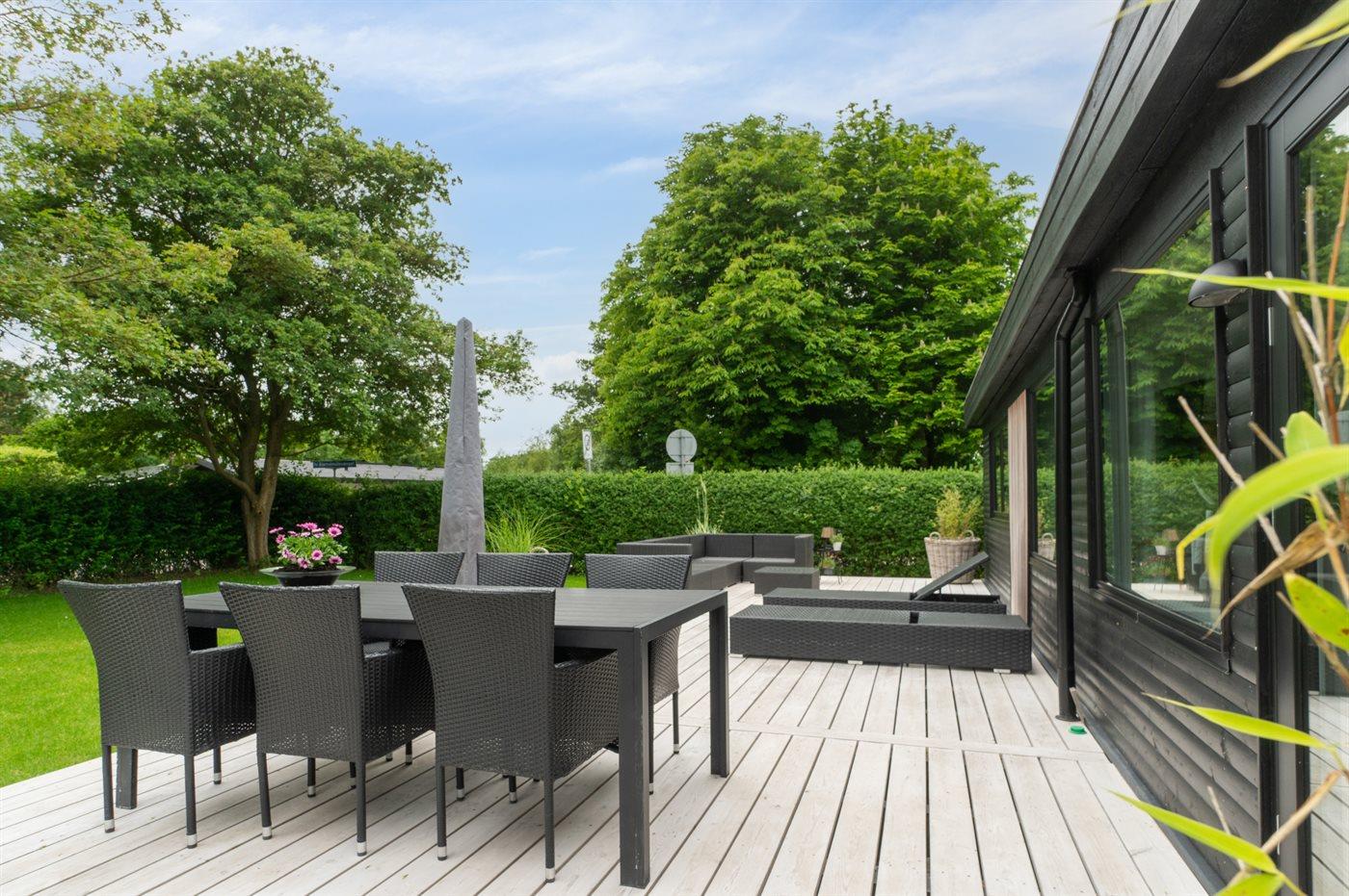 Moderne sommerhus tæt på vand og bymidte i Juelsminde med gode terrasser og hyggelig atmosfære.