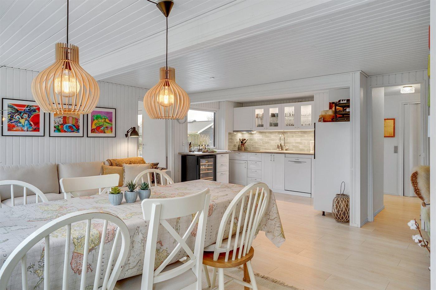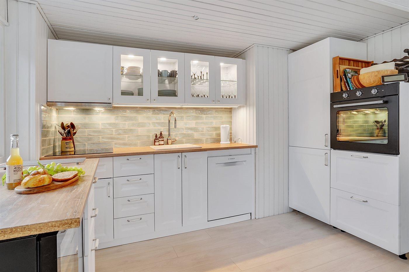 Køkkenet er udstyret med 1 køleskab. Der er 4 keramiske kogeplader, varmluftovn samt opvaskemaskine.