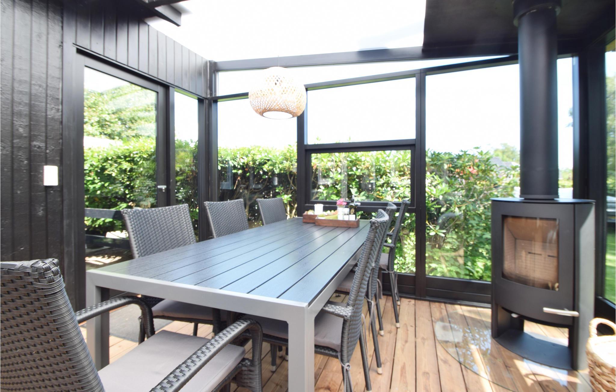 Ved dette hyggelige feriehus er haven velholdt med flotte bede og dejlige terrasserum. Den store overdækkede terrasse vil helt sikkert være et samlingssted for hele familien. Huset er indrettet med tre gode soveværelser, der er en dobbeltseng i hver af de to værelser og etageseng i det sidste værelse. Alle terrasser har gode havemøbler, så I kan nyde det gode vejr og slappe af med en god bog eller nyde hinandens selskab. Haven bag huset er lukket af med trådhegn i hækken og lågen kan lukkes, så her kan jeres hund løbe frit og børn færdes trygt.