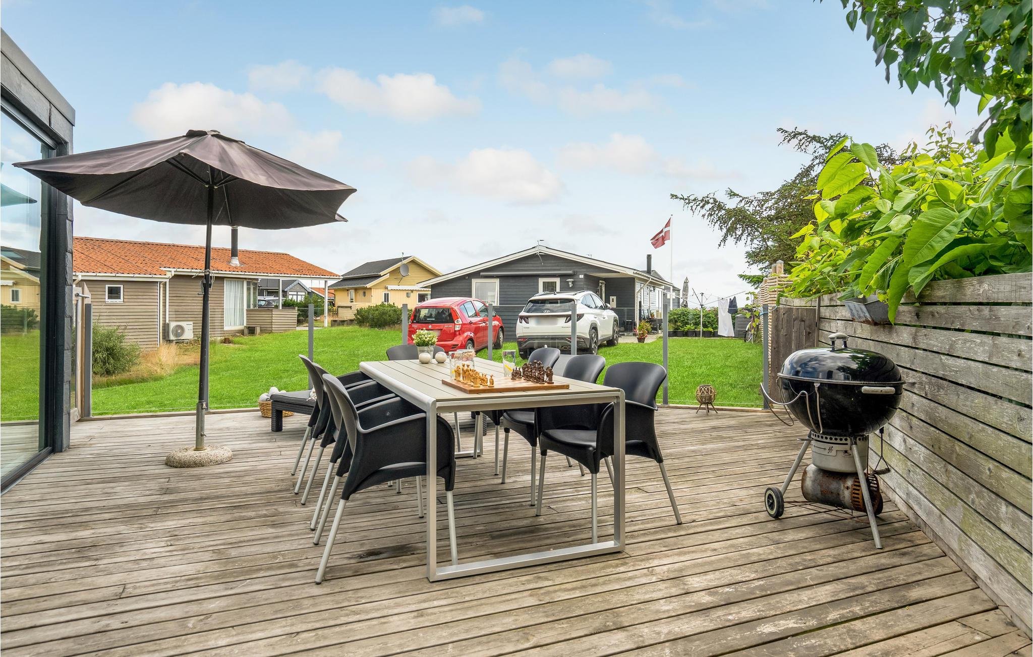 Fra stuen er der udgang til de lukkede terrasser med havemøbler. Her finder I flere hyggelige hjørner, hvor I kan sætte jer med et tæppe og en kop te, spille brætspil eller læse en god bog. Tænd op i grillen om aftenen og tilbered et lækkert sommermåltid til de andre gæster – her kan I virkelig nyde de lange, lyse nætter i fulde drag.
