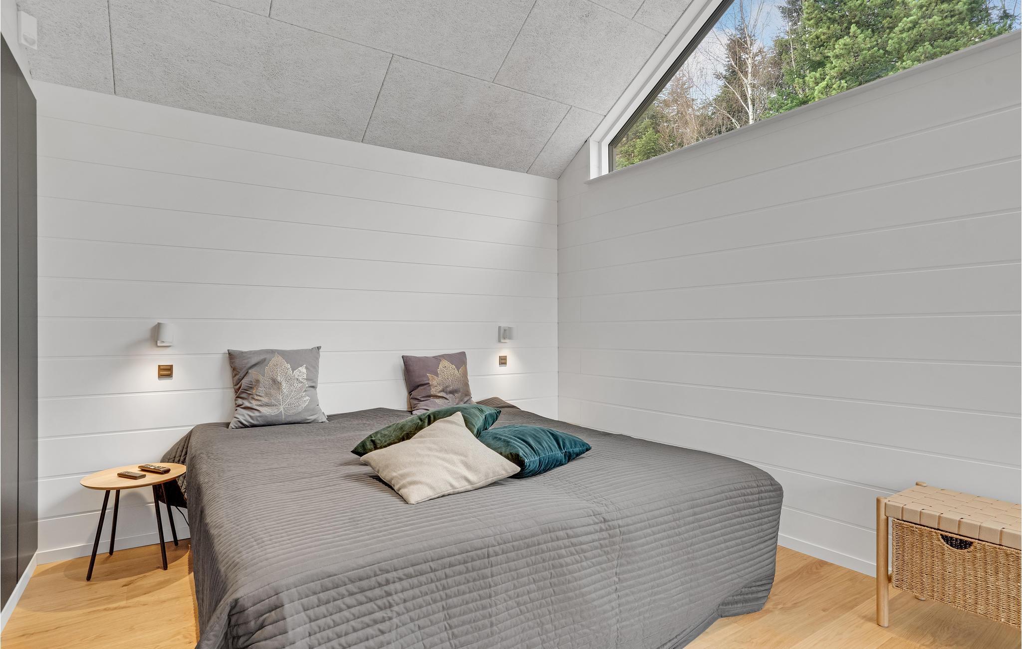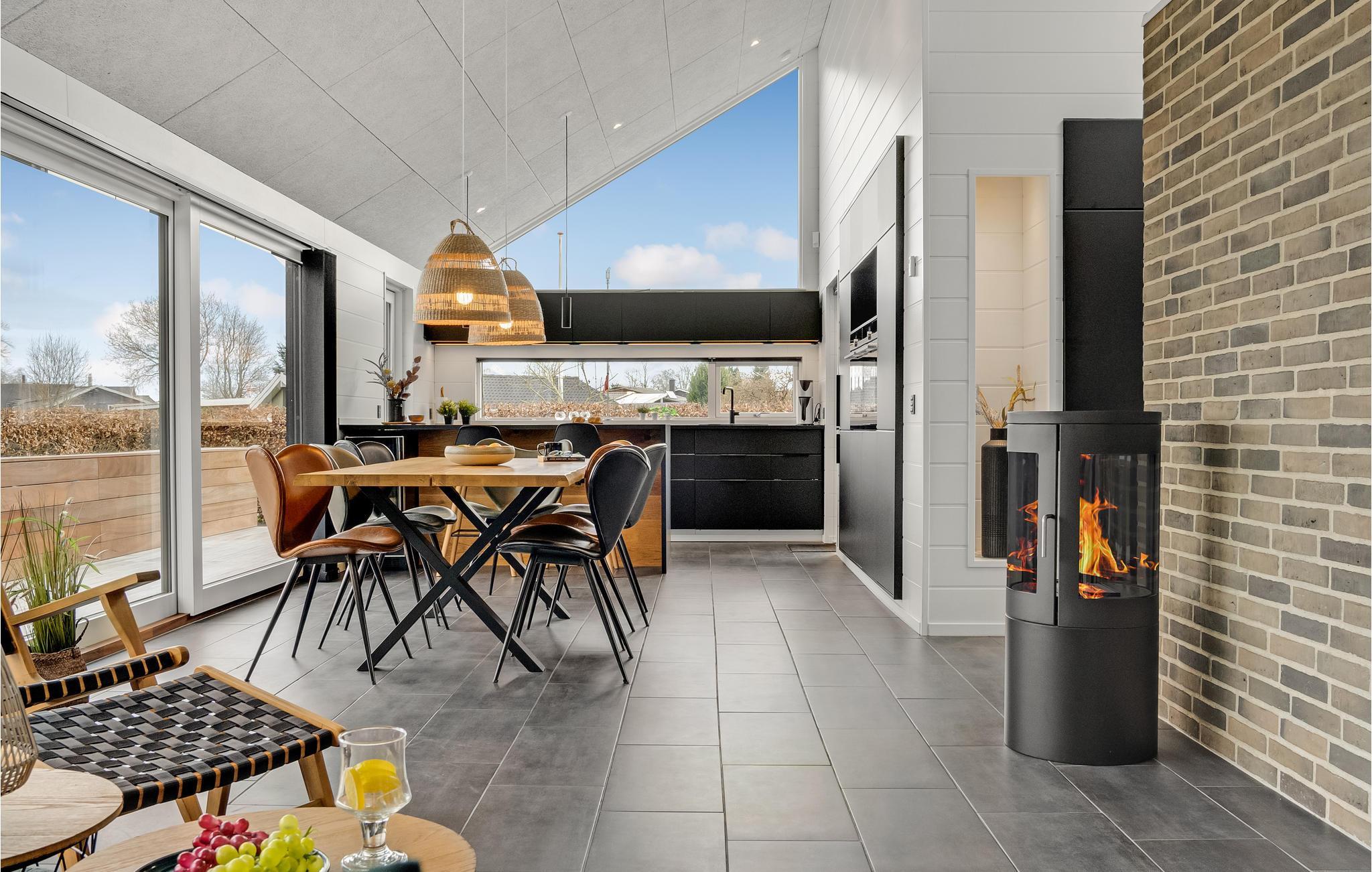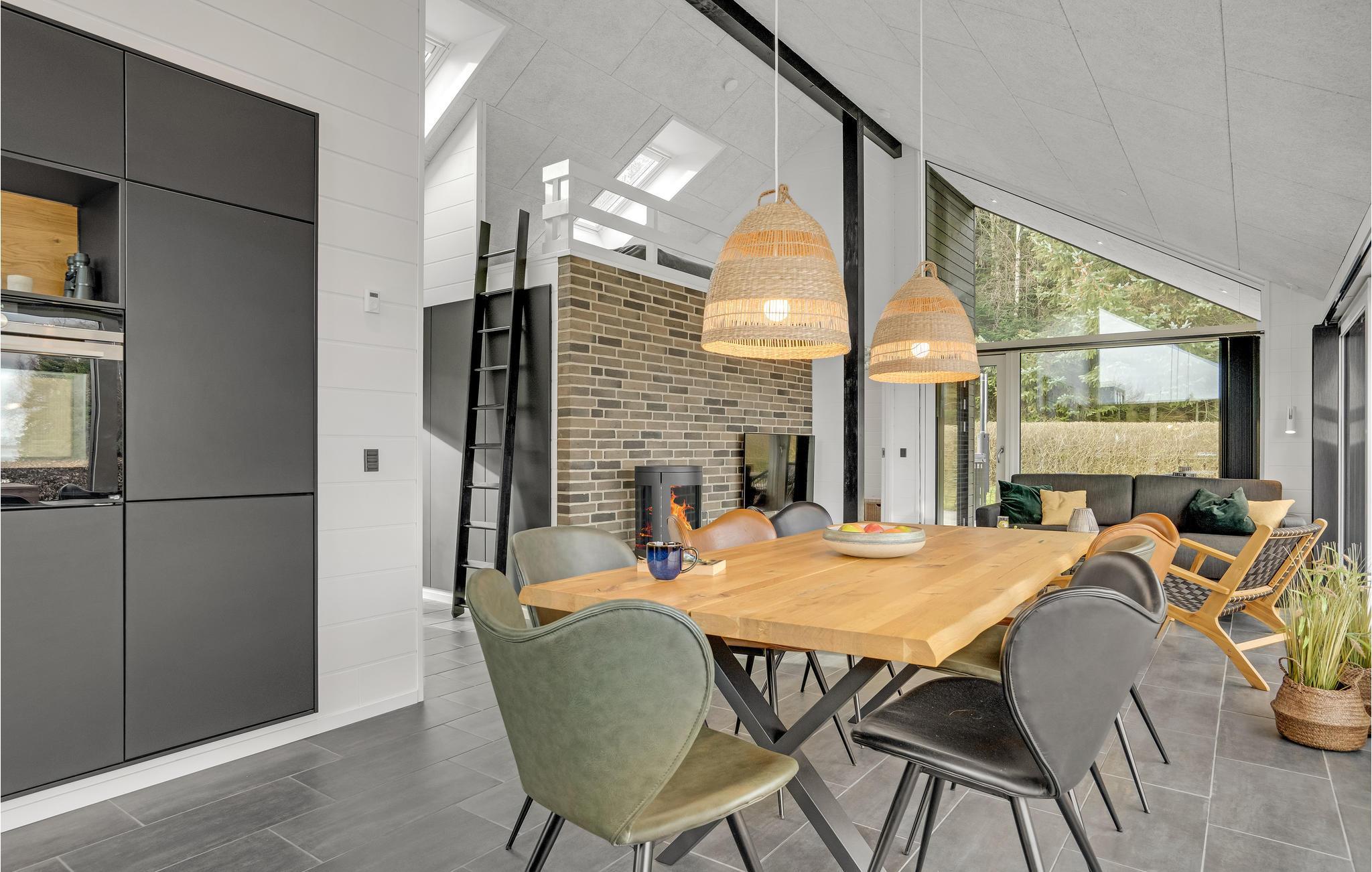 Det moderne og elegante hus byder velkommen i udkanten af skoven og byder på en vidunderlig udsigt over fjorden gennem de store panoramavinduer. Føl jer rigtig godt tilpas i disse lyse, indbydende og stilfulde rammer, hvor det vil være nemt for jer at glemme hverdagen. Spis sammen ved det lange spisebord og tilbring hyggelige aftener i sofaen ved den knitrende ild i brændeovnen, hvorfra I kan nyde en magisk udsigt til de smukke omgivelser.