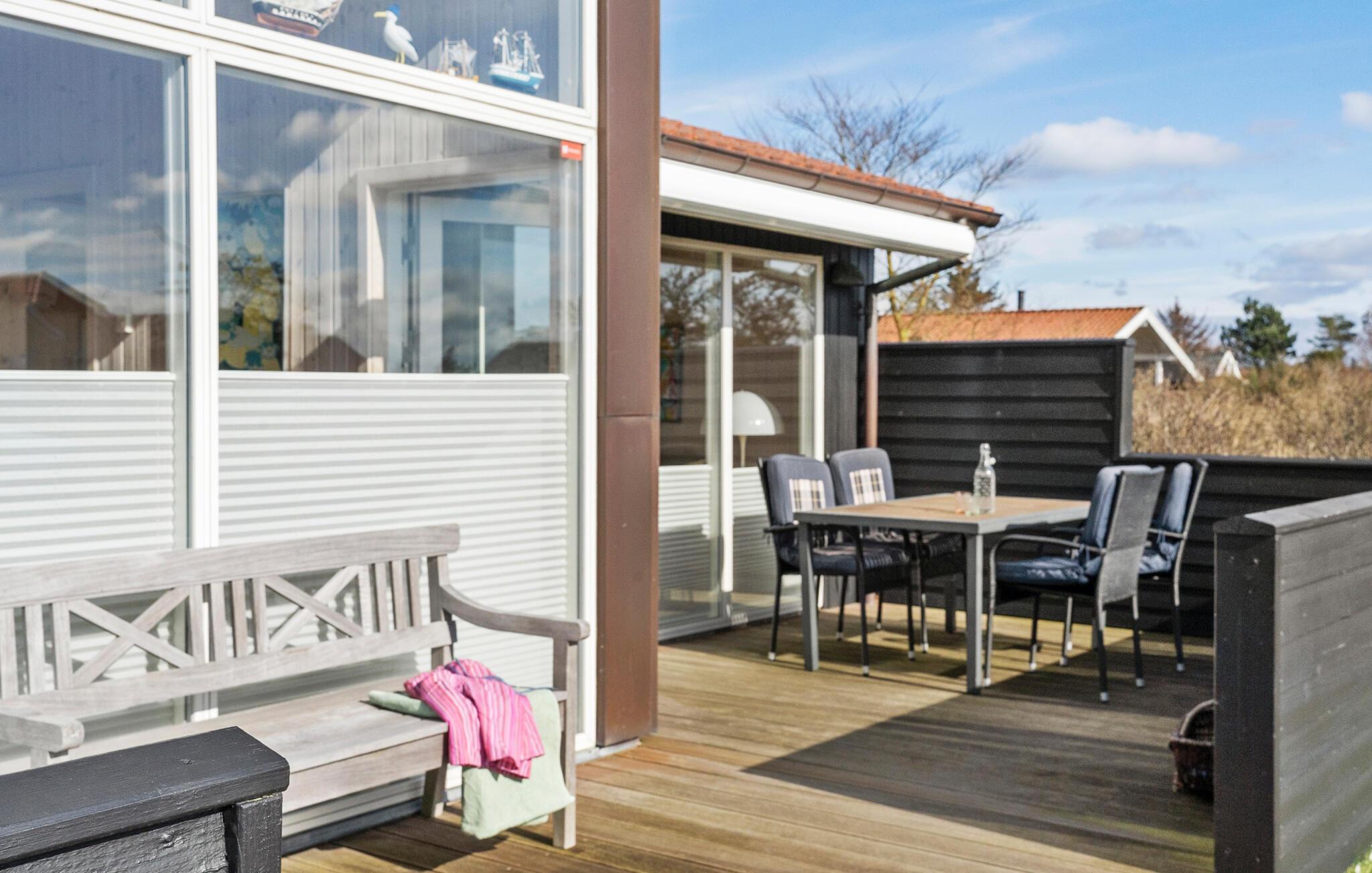Glæd jer til nogle afslappende stunder i det store udeområde. Den omfattende træterrasse byder på forskellige siddemuligheder, så I i fred og ro kan nyde solen og den friske luft. Begynd dagene her med en lækker morgenmad og afslut dagen med et glas vin på bænken. Den velholdte græsplæne lægger op til leg og afslapning.