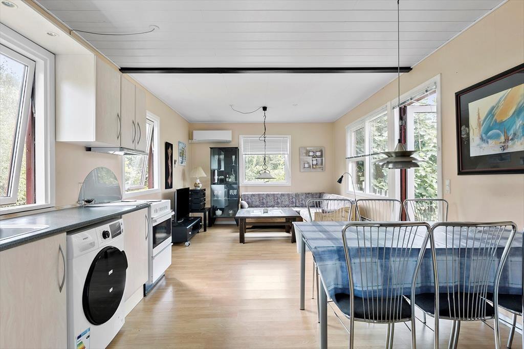 Stue/køkken i åben forbindelse. Hyggeligt stuehjørne med dobbelt sovesofa. Spisebord med stole. Varmepumpe. TV