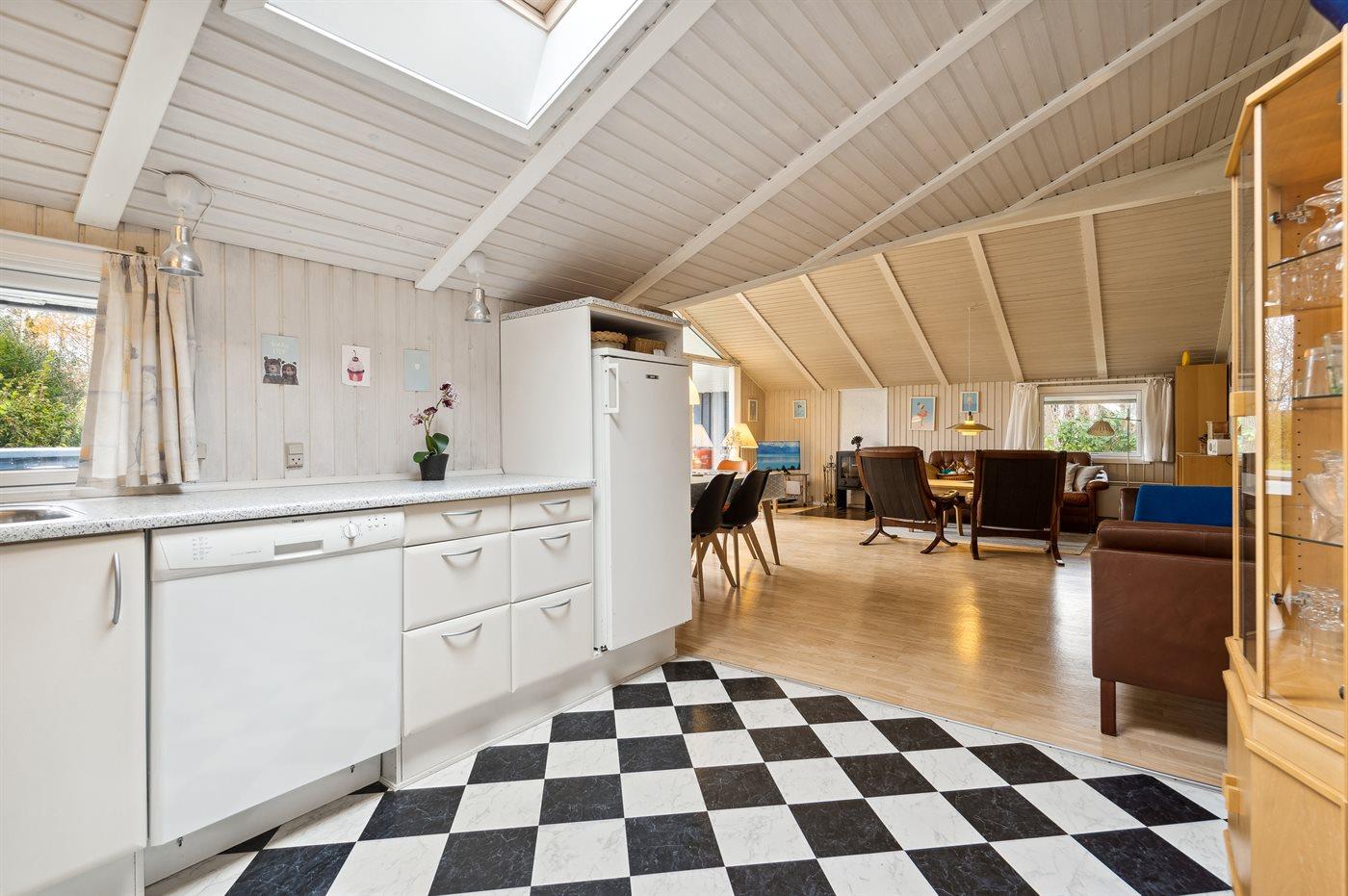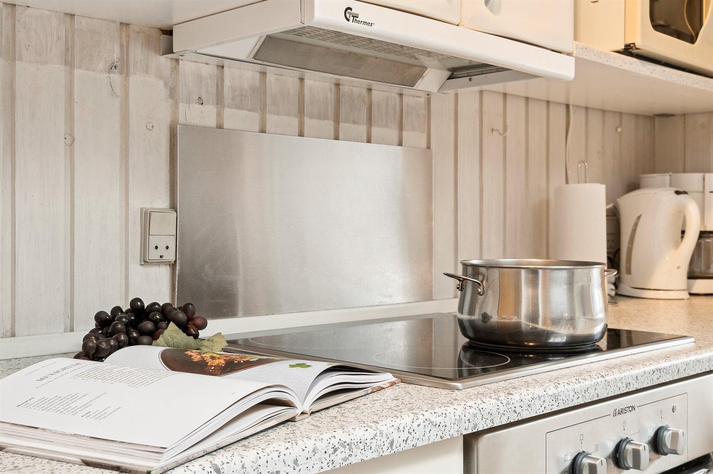 Køkkenet er udstyret med 1 køleskab. Der er 4 keramiske kogeplader, varmluftovn, mikrobølgeovn samt opvaskemaskine.