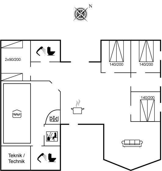 Der er i alt 4 soveværelser. Sovepladserne fordeler sig på: 6 sovepladser i dobbeltsenge. 2 sovepladser i enkeltsenge. 2 sovepladser på madrasser. 2 af disse sovepladser befinder sig på husets hems. Derudover er der 1 stk. barneseng.