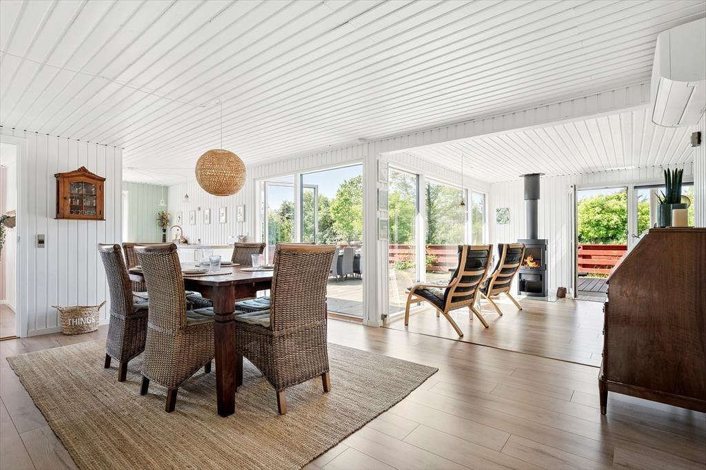 Efter en grundig renovering i 2022 præsenterer det 80 m2 store sommerhus sig på flot og charmerende vis. I kan straks føle jer hjemme inden døre i de velindrettede rum, der som en fin detalje har fået tildelt hver sin sommerlige pastelfarve. De store vinduespartier inviterer sollyset ind og giver udsigt til de smukke naturomgivelser – ikke bare fra stuen, men også fra de tre soveværelser. To af soveværelserne er indrettet med dobbeltseng, og det tredje byder på to gode enkeltsenge. Et stort badeværelse med vaskemaskine og bruseniche hører også med til planløsningen, og endelig er der stuen, som er et stort opholdsrum med åbent køkken i den ene ende. Køkkenet er nyt, men er indrettet som et klassisk landkøkken, og det indbyder til masser af hyggestunder ved komfuret og omkring spisebordet. I kan også se frem til at slappe af i opholdsstuen i en komfortabel sofa med ild i brændeovnen og en god film på fladskærmen.