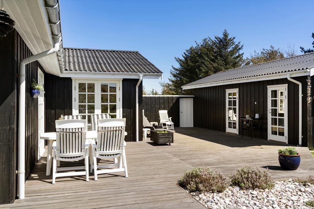 Sommerhuset ligger på en stor og let kuperet naturgrund med god læ fra de bakkede klitter. På sydsiden er anlagt et stort og skønt terrasseareal, hvor man er helt i fred for naboer og forbipasserende, og hvor man kan nyde sommerens gode vejr dagen lang. Om aftenen er det dejligt at trække ind under den overdækkede del, så man kan forlænge aftenen med et par timer.