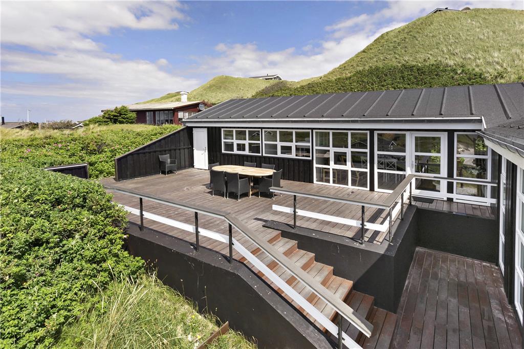Dette hus skiller sig positivt ud fra mængden med sin store dejlige terrasse, som løber på tre sider af huset og er omgivet af områdets skønne klitlandskab. Her er naturligvis både havemøbler og liggestole, så man er sikker på at kunne nyde sommerlivet maksimalt.