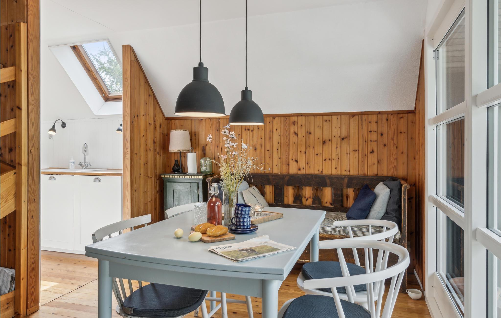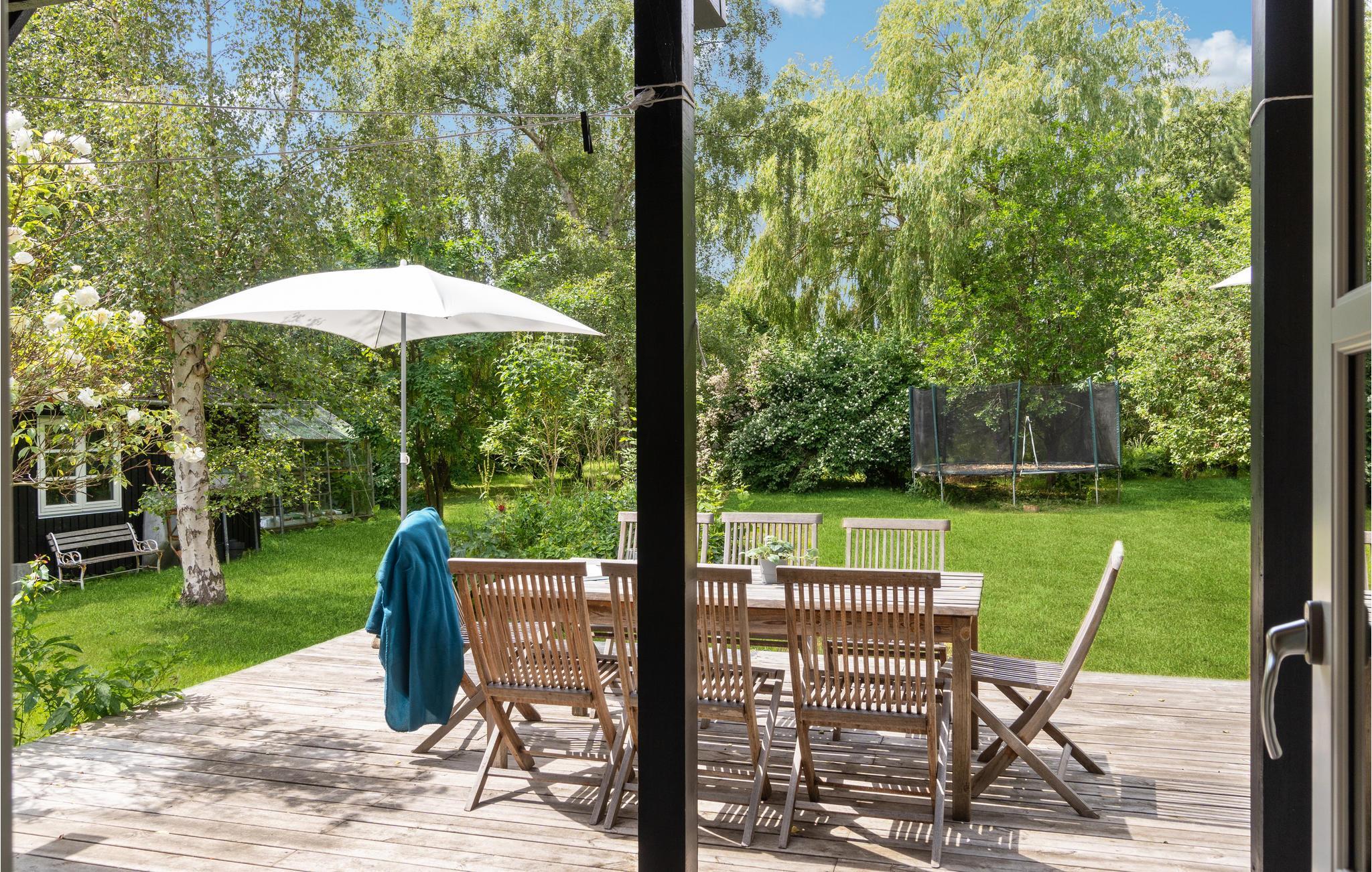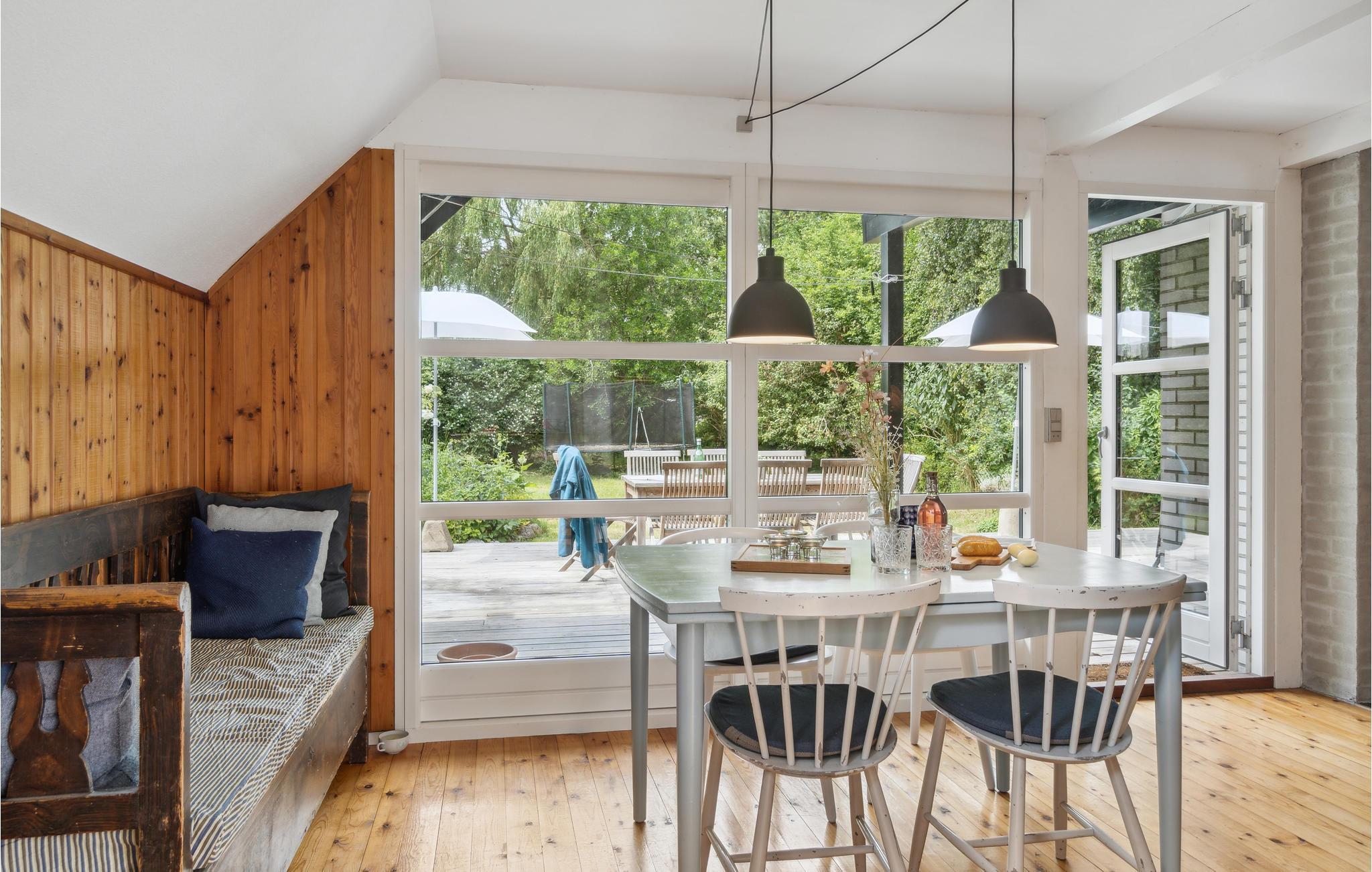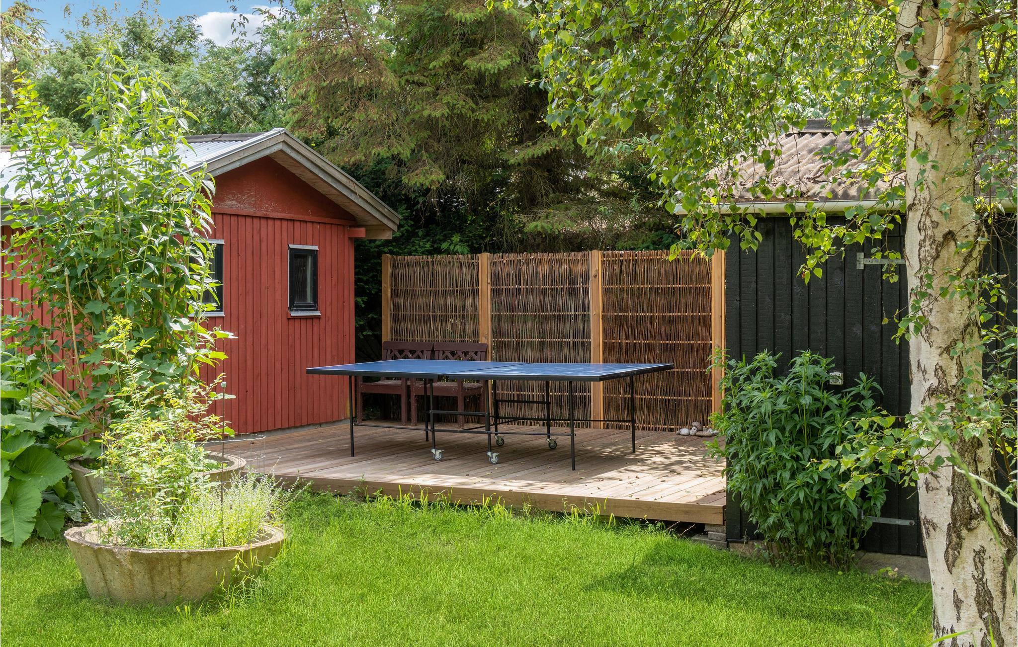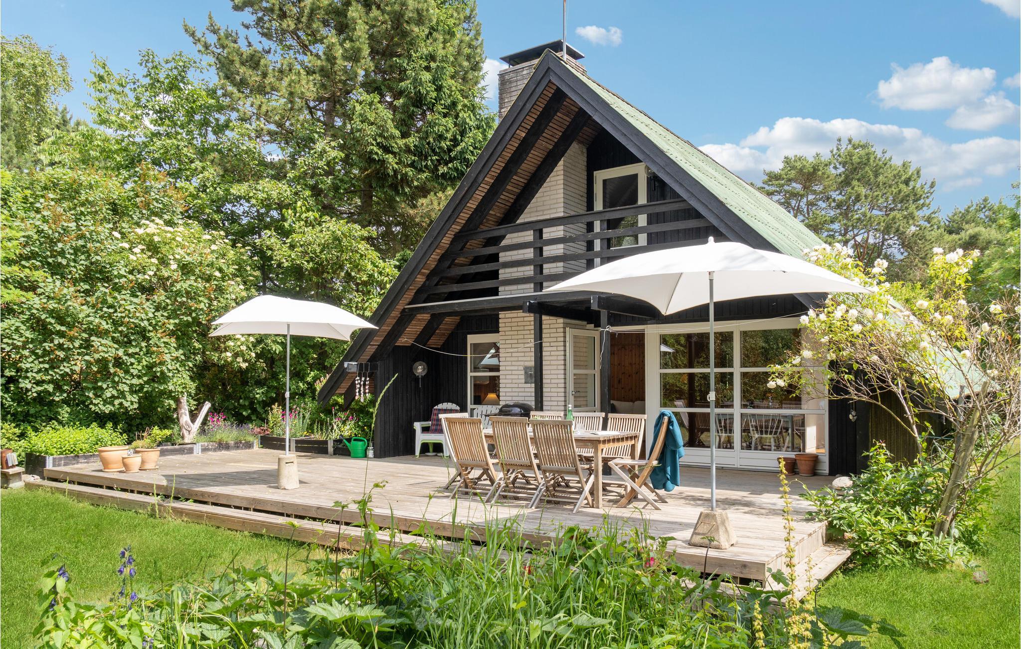 Velkommen til dette hyggelige sorte A-hus på en frodig naturgrund, blot 150 m fra vandet. Huset er praktisk og lyst indrettet, og naturtræet tilfører rummene et varmt udtryk. Tilbring dejlige aftener i stuen med brætspil og varm jer foran pejsen med en kop kakao i den kølige årstid. Når vejret er godt, kan I udfordre hinanden i kroket eller bordtennis og forfriske jer med kølige drikke under parasollen på den store træterrasse. Nyd en kop kaffe på bænken om morgenen med kig til grønne trækroner og lyt til fuglenes glade sang. En tur til den nærliggende strand bliver helt sikkert en fast del af dagsprogrammet. Her er også gode fiskesteder.