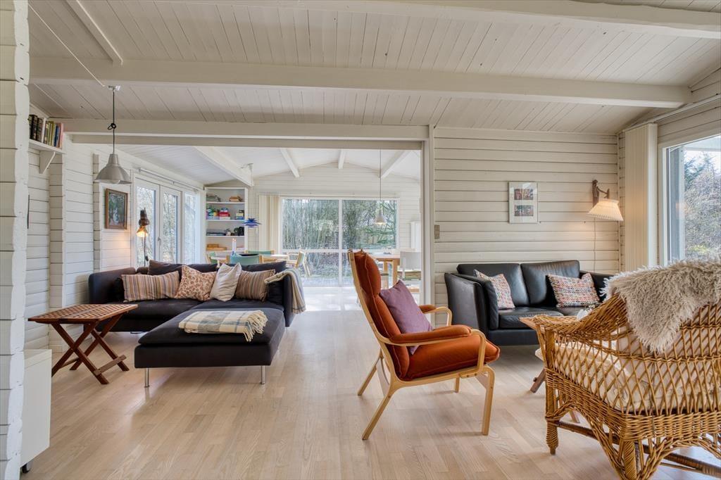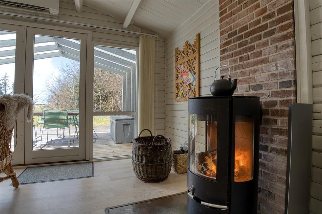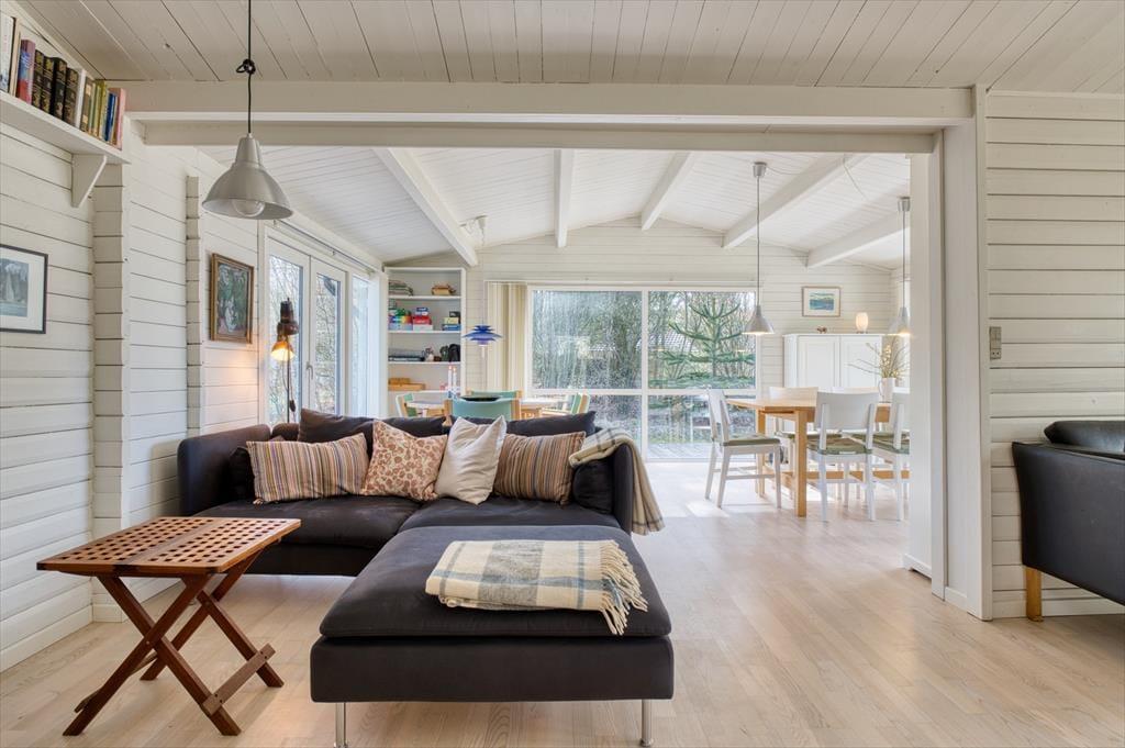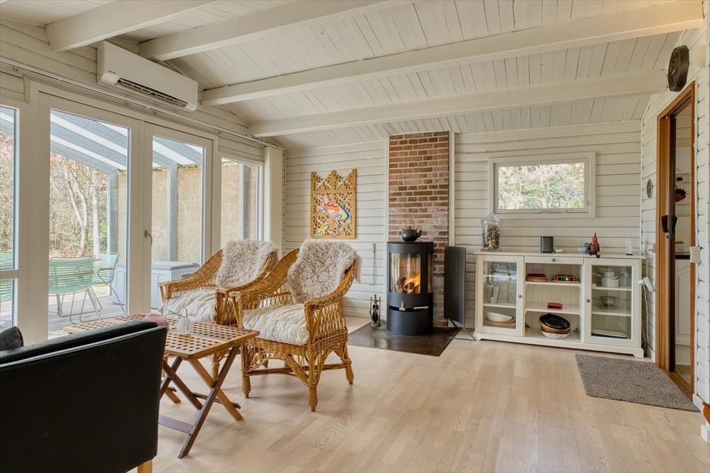Allerede ved ankomsten mærker du den afslappede feriestemning, som strømmer fra det lyse og venlige sommerhus. Her er højt til loftet – både billedligt og bogstaveligt – og rummet er indrettet, så det inviterer til nærvær og samvær. I stuen kan I samle jer omkring brændeovnen, der knitrer hyggeligt på kølige aftener, og med det åbne opholdsrum har I altid følelsen af at være tæt på hinanden – uanset om nogle spiller kort, mens andre laver mad. Indretningen er enkel og behagelig, med et naturligt lysindfald, der strømmer ind gennem vinduerne og giver huset en dejlig lethed. Når det er sengetid, kan hele familien finde sig til rette, for her er god plads til op til syv personer, så både venner, bedsteforældre eller teenagebørn kan være med.
