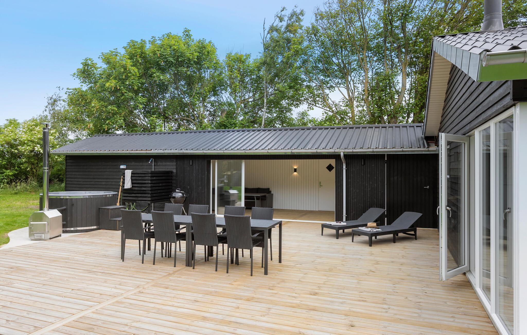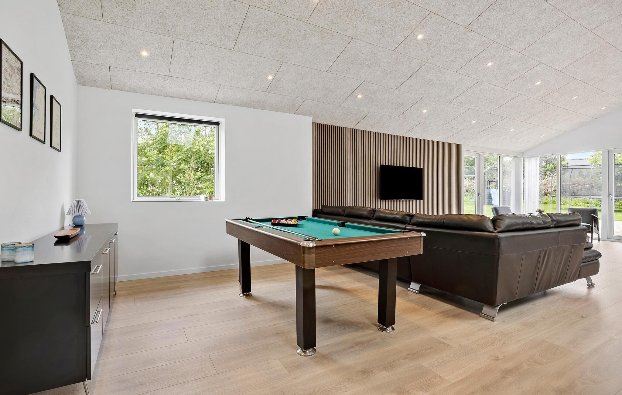 Moderne feriehus nær Knud Strand med poolbord, vildmarksbad og stor terrasse i naturskønne omgivelser.