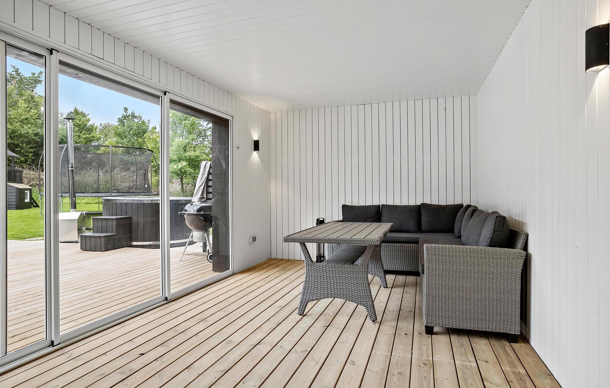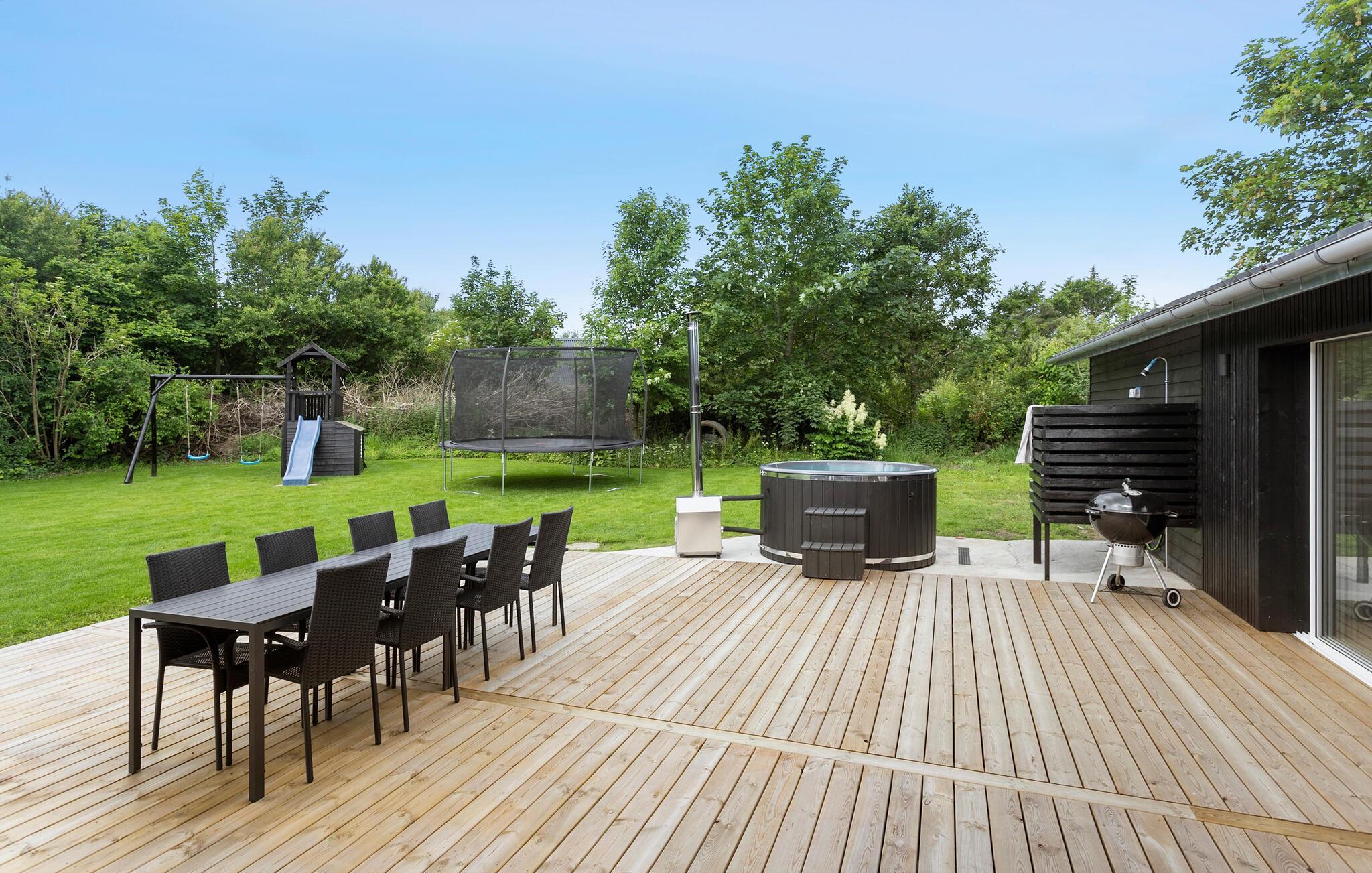 Træd ud på den store træterrasse, som er udstyret med et langt spisebord og masser af plads til at slappe af. Brug det overdækkede udendørsområde med loungemøbler eller forkæl jer selv med et varmt bad i vildmarksbadet. Den store grund er dejligt privat, så her har I fred og ro.