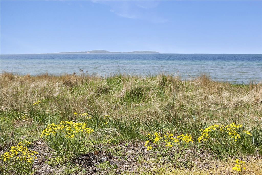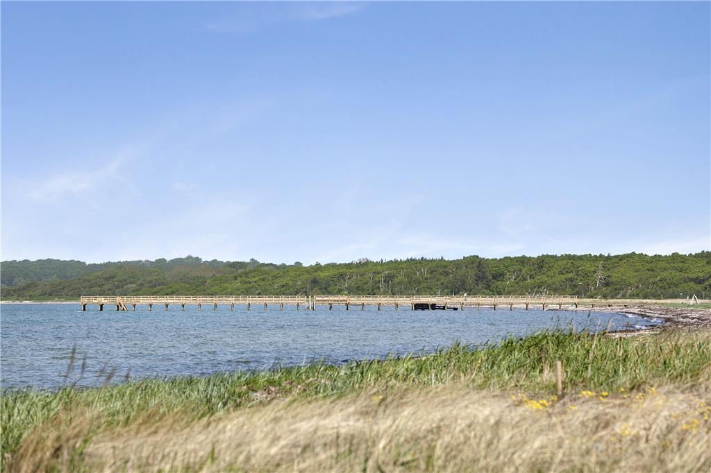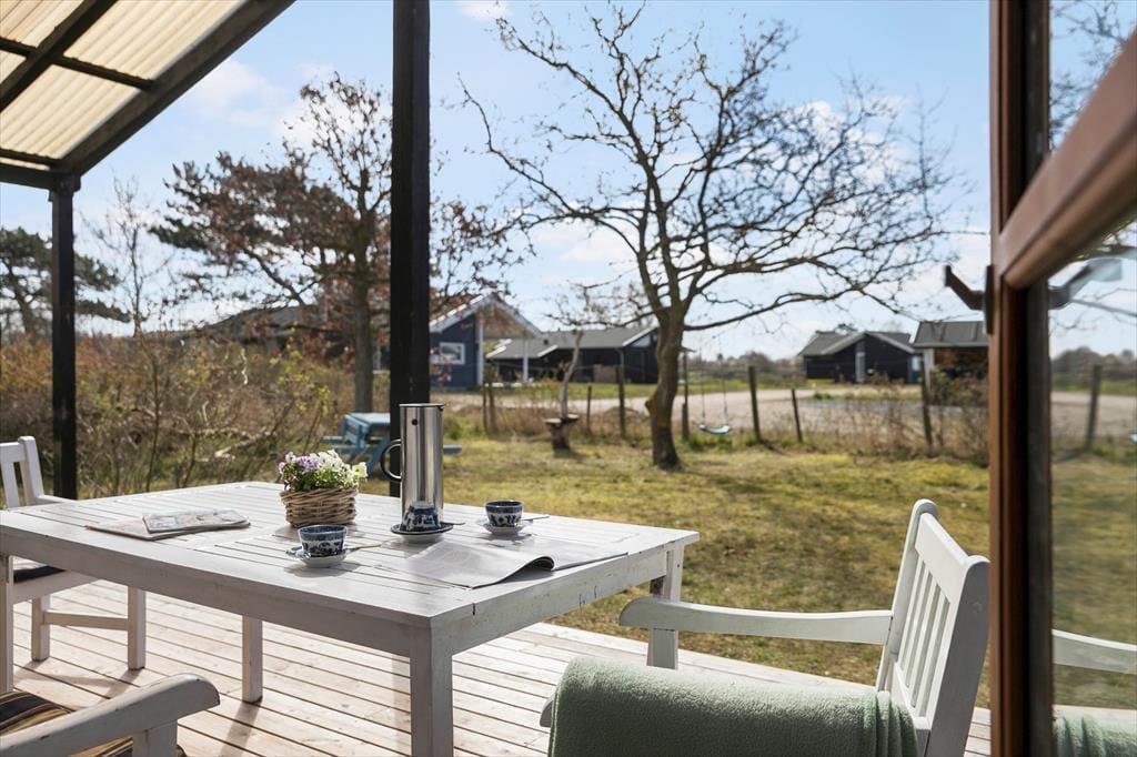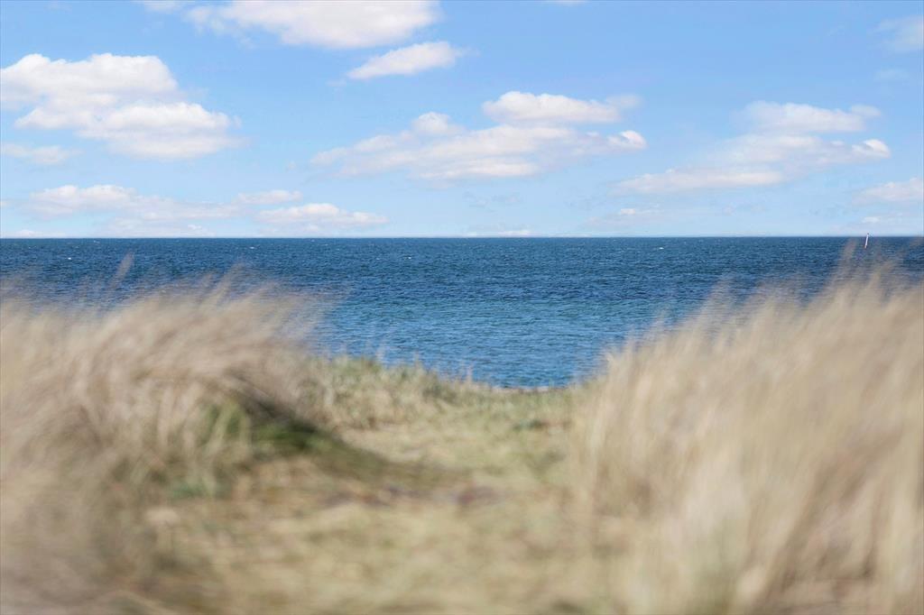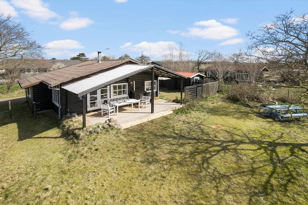 Huset har en 652 m2 indhegnet grund, hvorfra der er kig til vandet. Omkring huset er der flere terrasser, så solen kan følges og nydes fra den står op og lige til solnedgang. Ved feriehuset er der havemøbler, liggestole, parasol, grill, Trampolin og en gynge