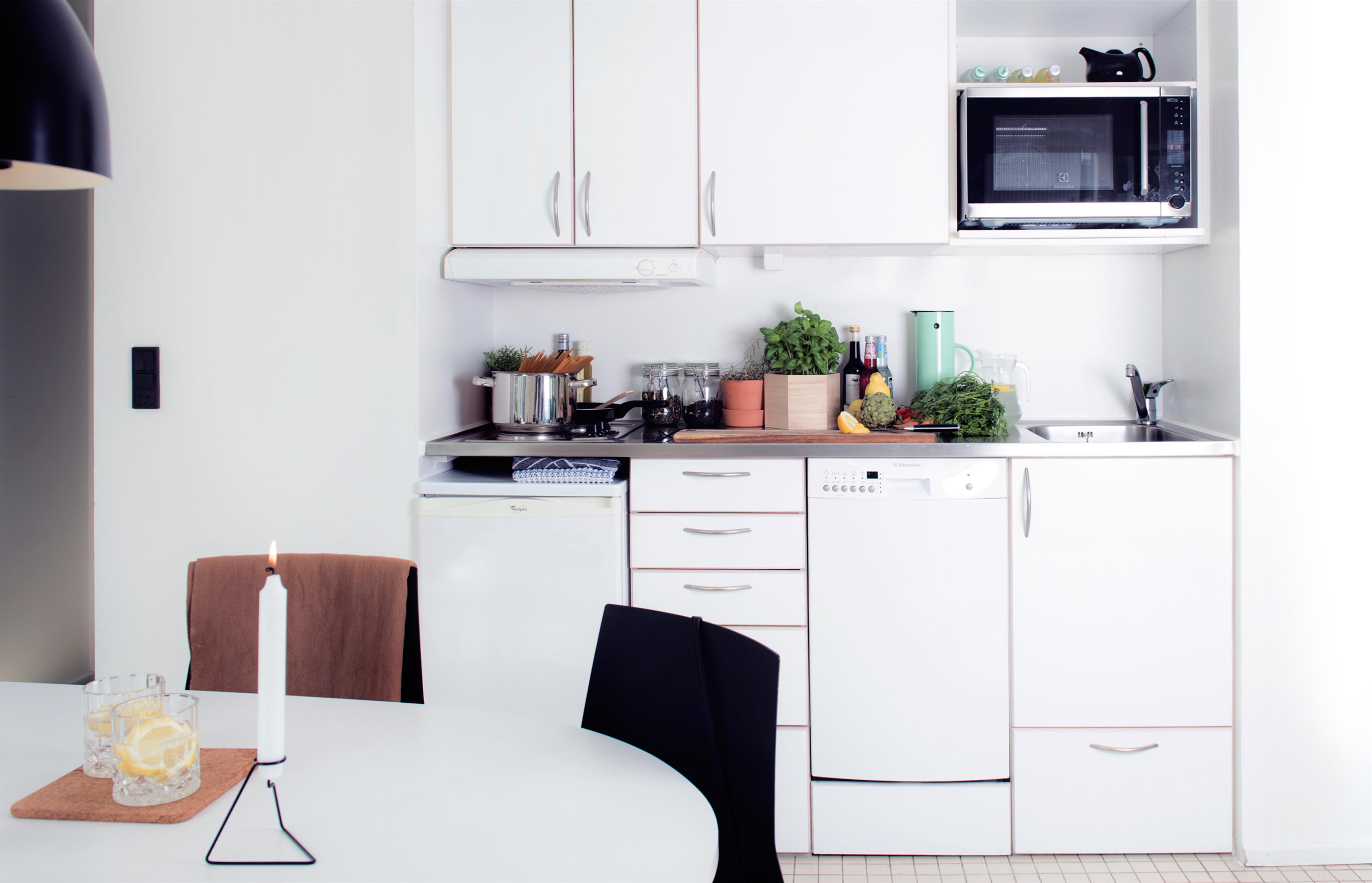 Køkkenet er fuldt udstyret med 2 kogeplader, ovn, kaffemaskine, elkedel, køleskab med fryseboks, brødrister samt gryder og service, så I kan lave jeres egne måltider. Alle lejligheder har TV og lynhurtigt trådløst internet.