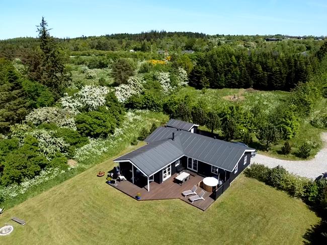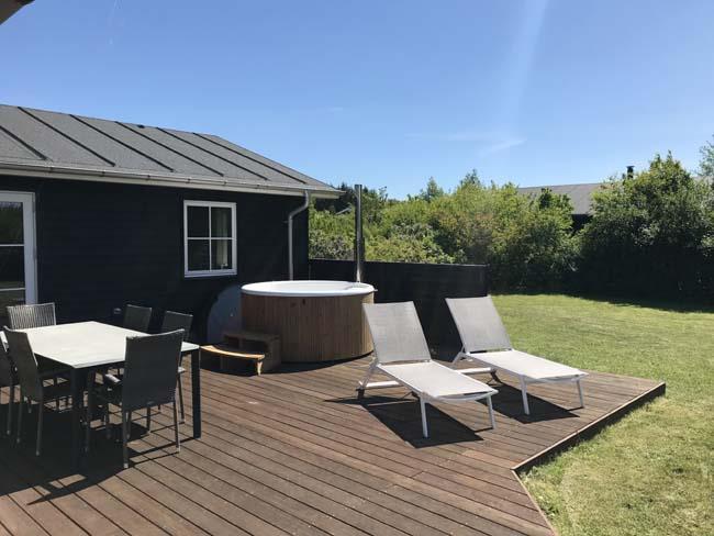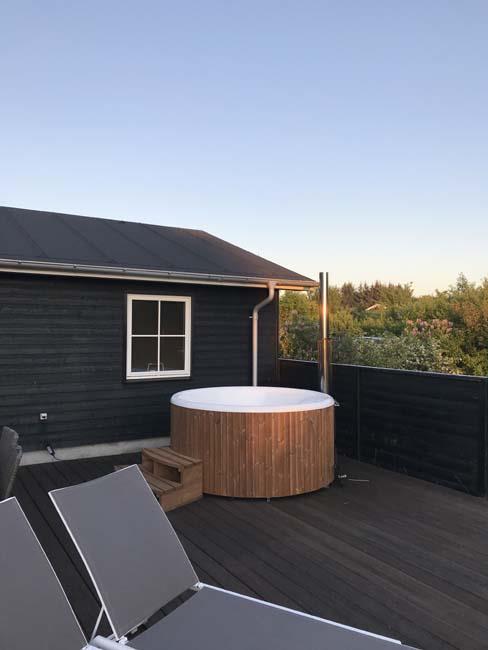 Skønt sommerhus nær skov og by, med store terrasser og spabad.