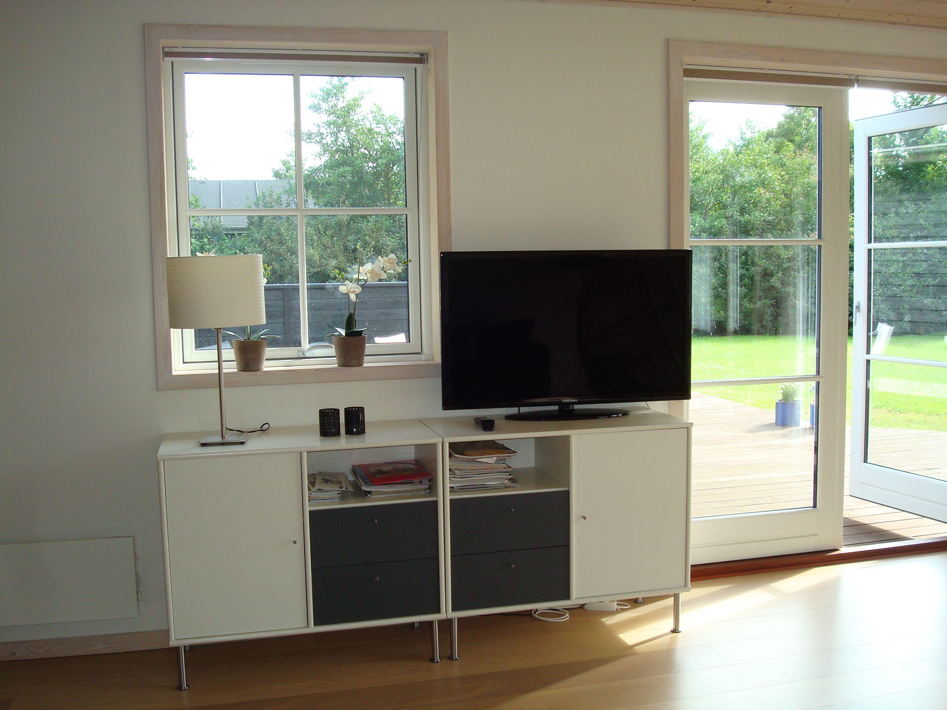 Går man et trin ned fra klinkerne, kommer man ned i en hyggelig og smart stue. Her er der en stor lækker læder sofa, sækkestole og en hængende kurvestole. Her kan man med hele familien samt gæster sidde og hygge sig om aften, med et spil kort eller se en god film i tv'et. Indretningen her får én til at slappe af og nyde at være i nuet.