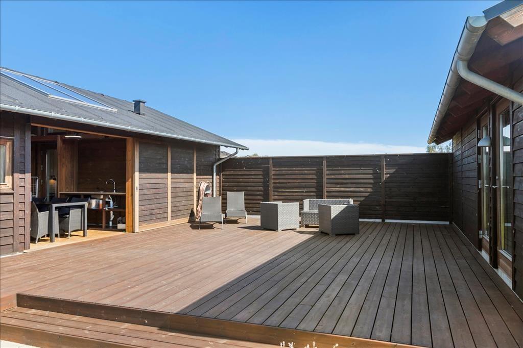 Takket være udekøkkenet og grillen har I et perfekt sted at kokkerere om sommeren – og så er der direkte adgang til træterrassen, hvis måltidet skal nydes under åben himmel. En del af terrassemiljøet ligger som en ugeneret oase mellem huset og carporten, og selvom den er afskærmet, er udsigten over det åbne landskab stadig forrygende. På den 1.279 m2 store grund er der gyngestativ til børnene, bålplads og god plads til havespil og boldspil på græsplænen.