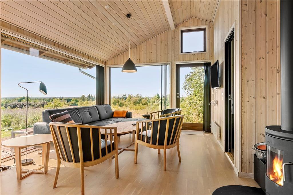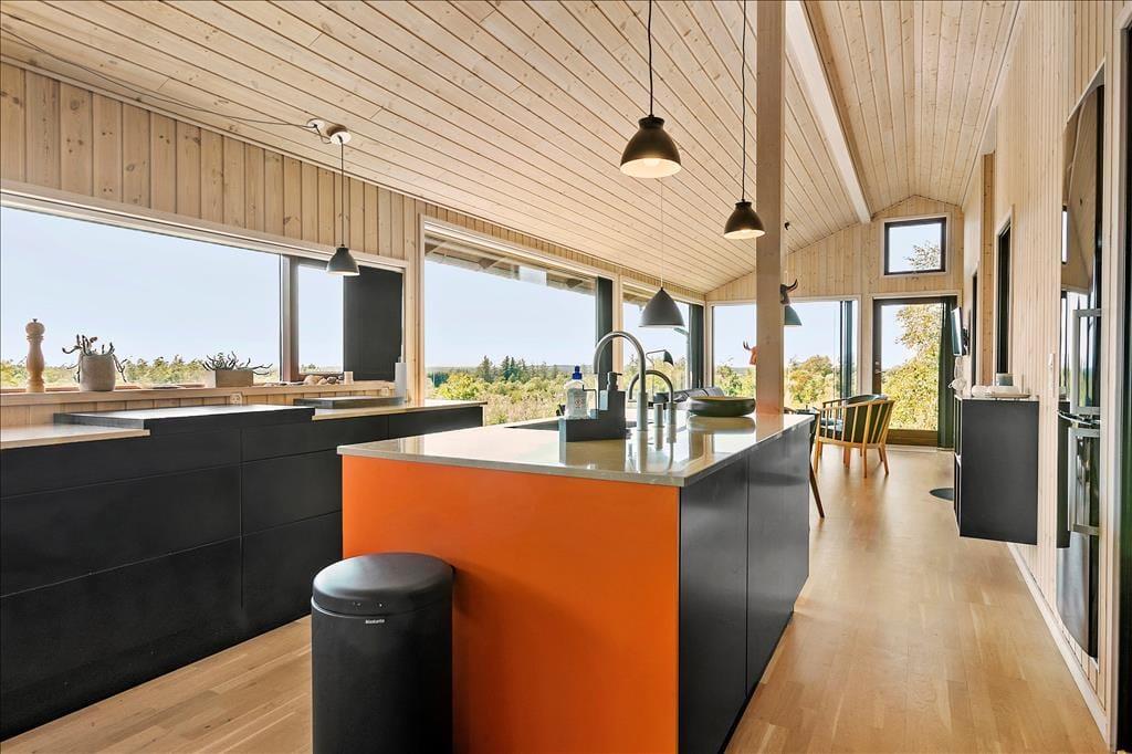 Sommerhuset er et kvalitetsbyggeri fra 2013, der byder jer indenfor i lyse og lækre rammer. Udsigten er allermest imponerende fra opholdsrummet, som er elegant indrettet med sofaafdeling, spisebord, brændeovn og et moderne åbent køkken. På grund af køkkenets generøse størrelse har I masser af plads til at kræse om maden – og derudover er der mange lækre detaljer, inklusiv et stort skærebræt, som er integreret i bordpladen, og en quooker, der leverer kogende vand direkte fra hanen. Husets komfur er placeret i en uopvarmet mellemgang/havestue, som også byder på udekøkken og grill. Rummet er udstyret med store ovenlysvinduer og skydeporte i begge sider, og derfor fungerer det som en smuk overgang mellem inde- og udemiljøet. Den gennemtænkte planløsning består for øvrigt af to badeværelser og tre soveværelser, hvoraf det ene soveværelse og badeværelse ligger for sig på den ene side af mellemgangen.