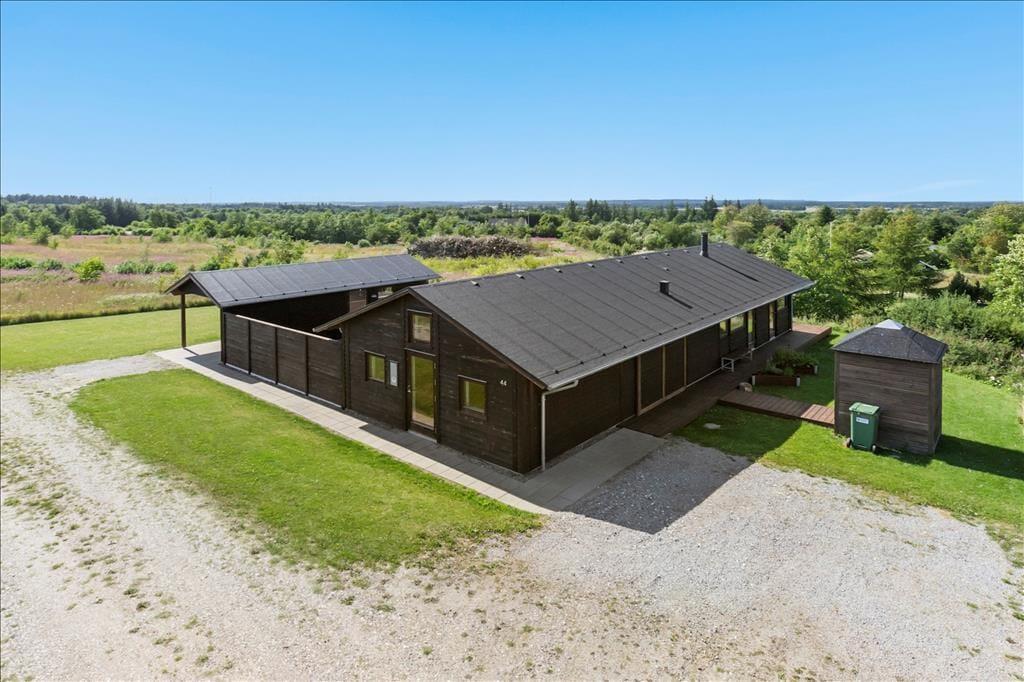 Dette flotte, arkitekttegnede træsommerhus har en glimrende planløsning, en stilfuld indretning og et skønt udemiljø med masser af dejlige opholdspladser. Vigtigt at fremhæve er desuden beliggenheden på en stor og højtliggende grund i Kollerup, for det betyder, at ferielivet kommer til at foregå med flot udsigt over skov og marker.