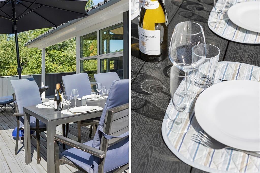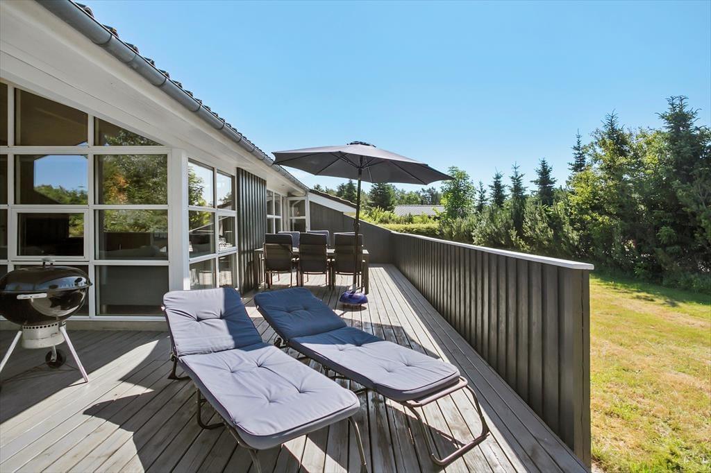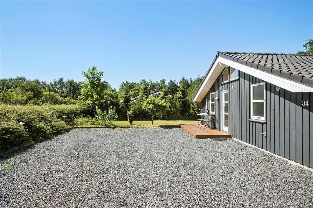 Sommerhuset ligger på en dejlig plænegrund i rolige og natursmukke omgivelser. Her er sandkasse til familiens yngste, og der er rigeligt med plads til at solbade og spille bold på græsset. Fra stuen kan man gå ud på den store sydvestvendte terrasse, hvor sommerlivet kan nydes i fulde drag. Terrassen er afskærmet og delvist overdækket, så trænger man til en pause fra solens stråler, kan man nemt trække ind i skyggen.