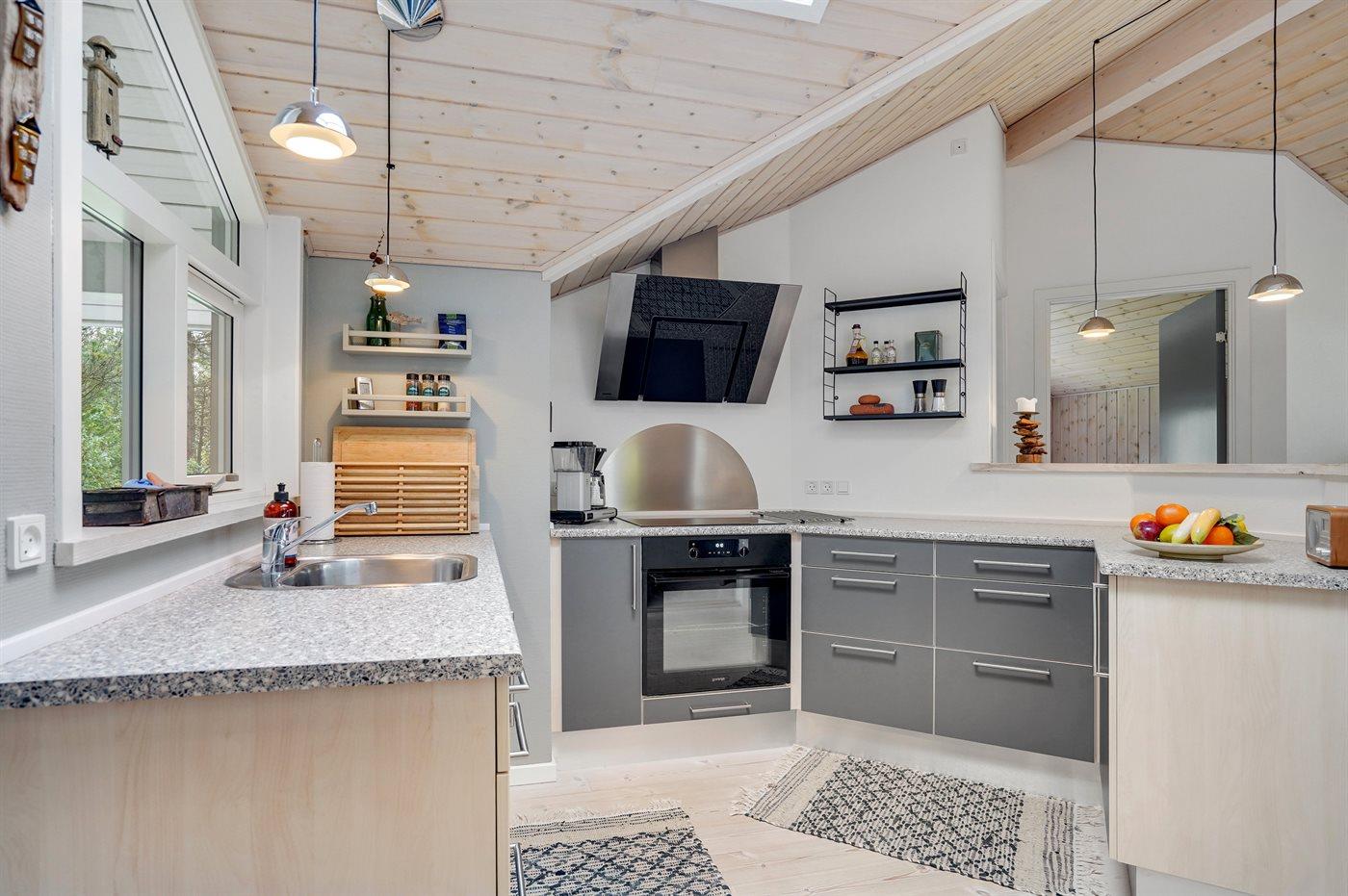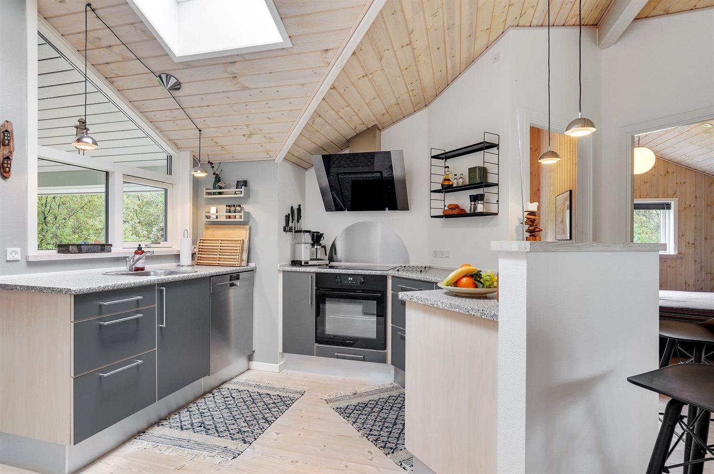 Køkkenet er udstyret med 1 køleskab. Der er 4 induktionskogeplader, varmluftovn, mikrobølgeovn samt opvaskemaskine.