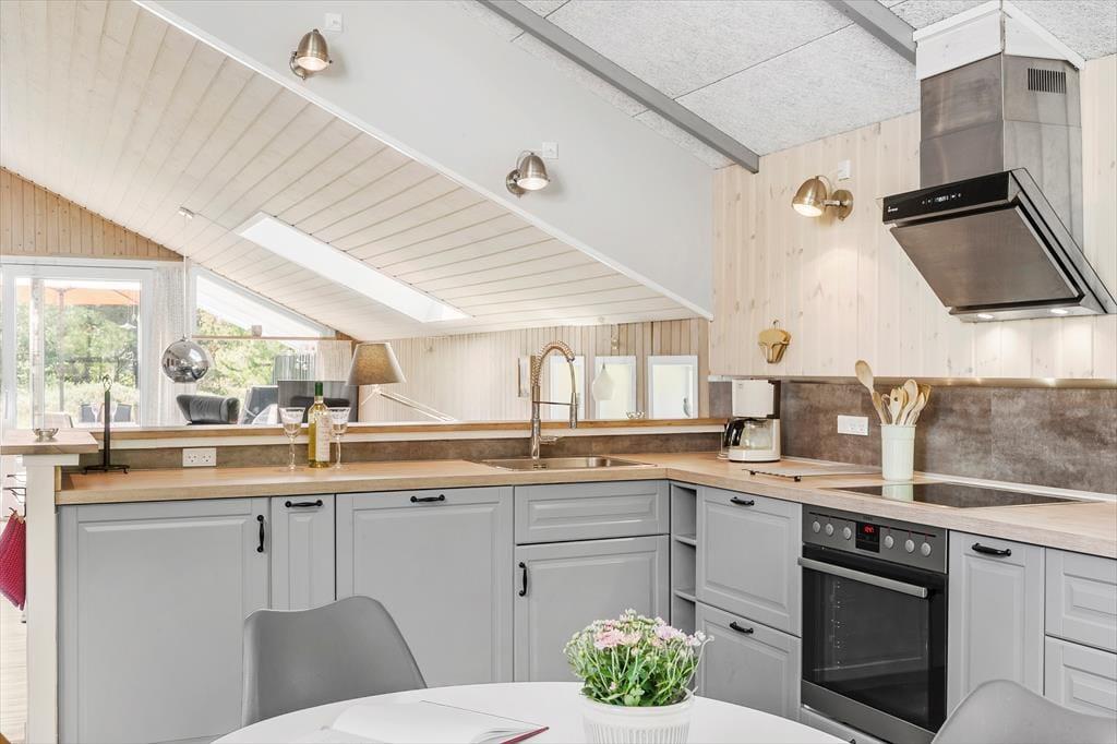 Det 84 m2 store og hyggelige træsommerhus er blevet renoveret i 2021, hvilket blandt andet kan ses på den flotte og rummelige køkkenafdeling, der udgør den ene ende af opholdsrummet. I den anden ende af rummet er der sofa, brændeovn og fladskærms-tv, så her er der lagt op til masser af hyggestunder i komfortable rammer. Et pænt badeværelse med bruser og vaskemaskine hører også med til planløsningen, og endelig er der tre soveværelser, hvoraf det ene er med dobbeltseng og de to andre med hver især to enkeltsenge.