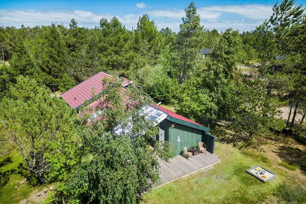 I kan nyde synet af den 2600 m2 store naturgrund inde fra sommerhuset, og når I træder ud på terrassen, bliver alle sanser vækket. Der lufter af lyng og anden vild beplantning, mens fuglene kvidrer fra trætoppene, og uanset om I mærker en mild brise eller solens varmende stråler, er det nemt at finde en god opholdsplads. Der er nemlig flere opholdspladser at vælge imellem, inklusiv en delvist overdækket træterrasse, og til børnene er der gynger og sandkasse.
