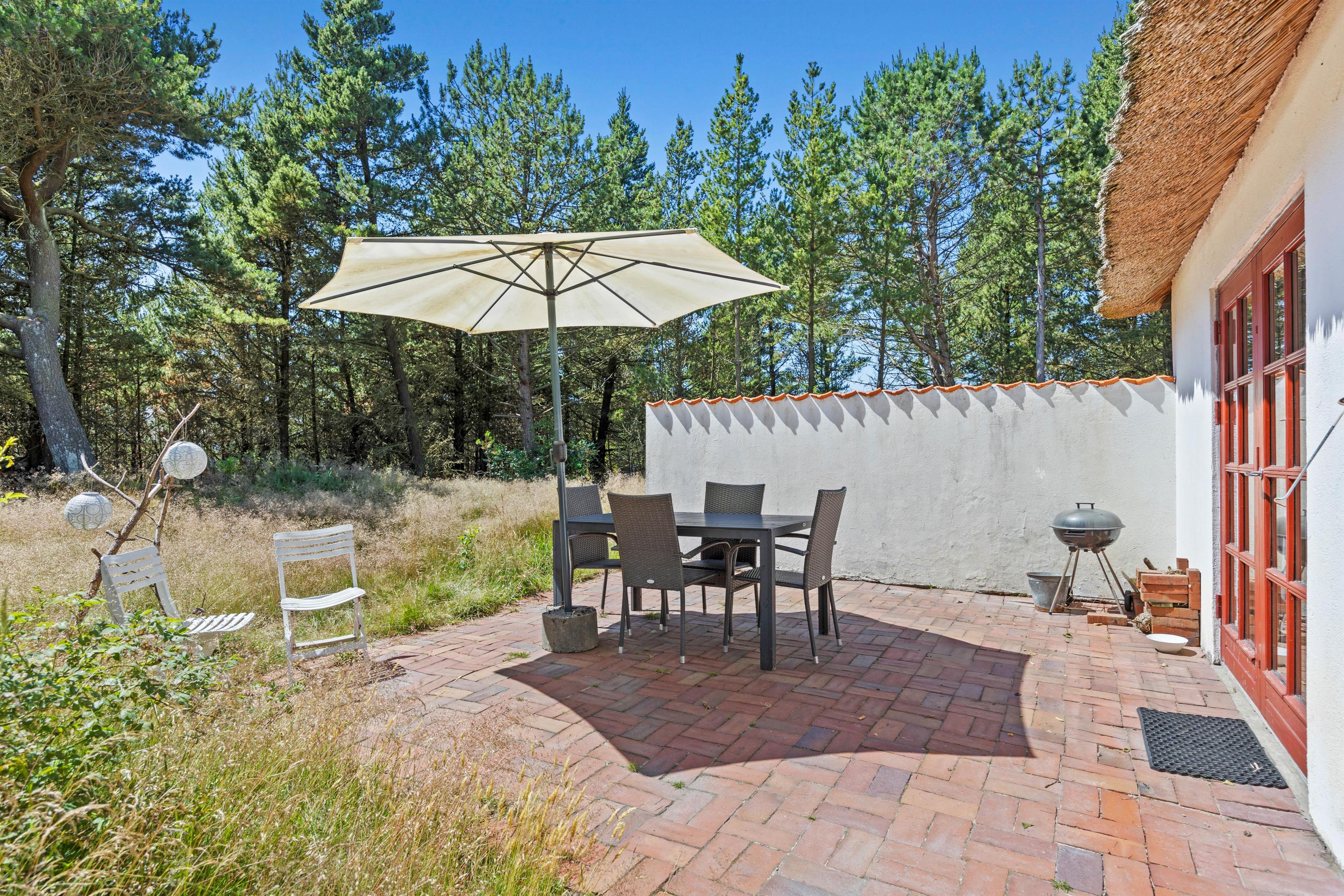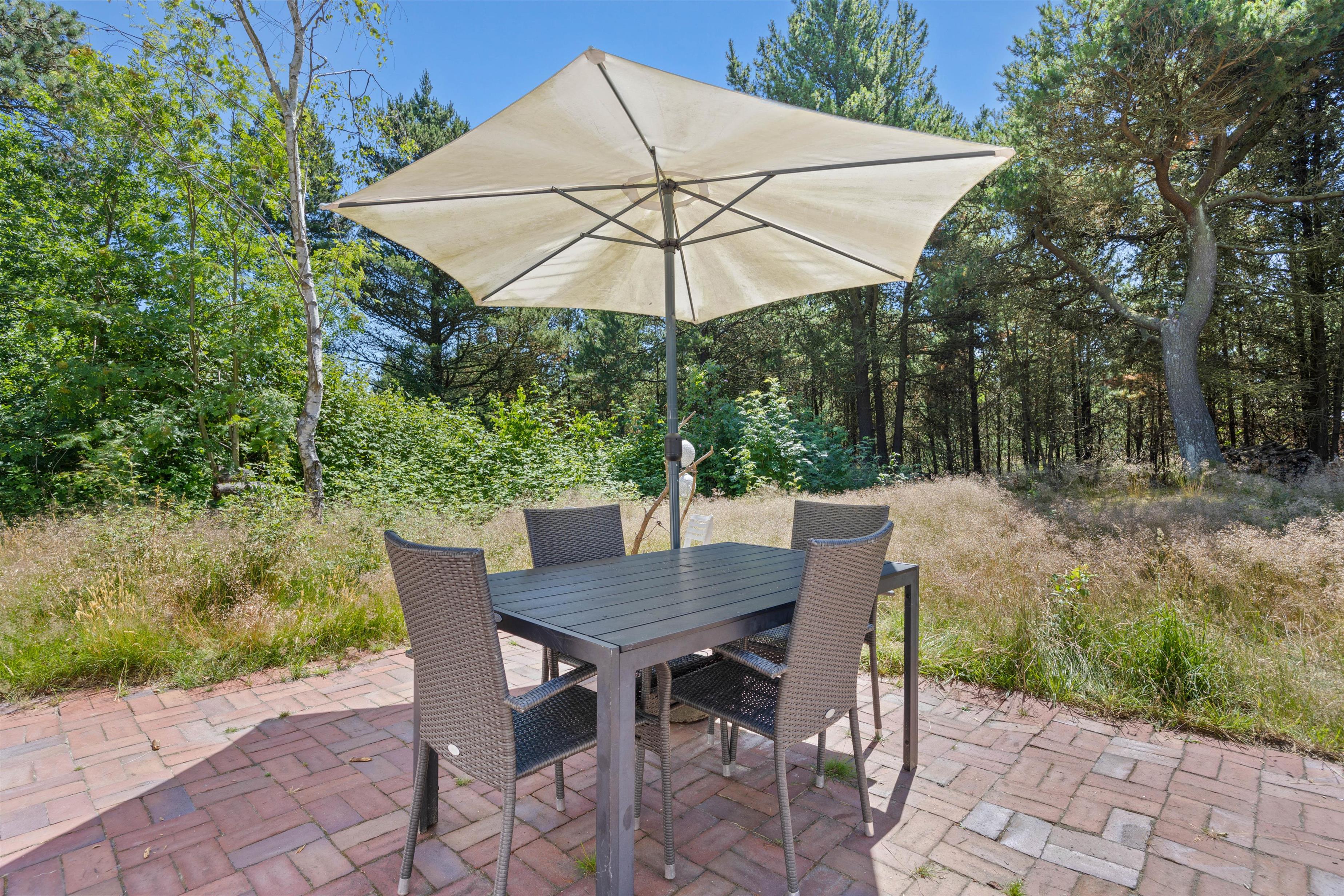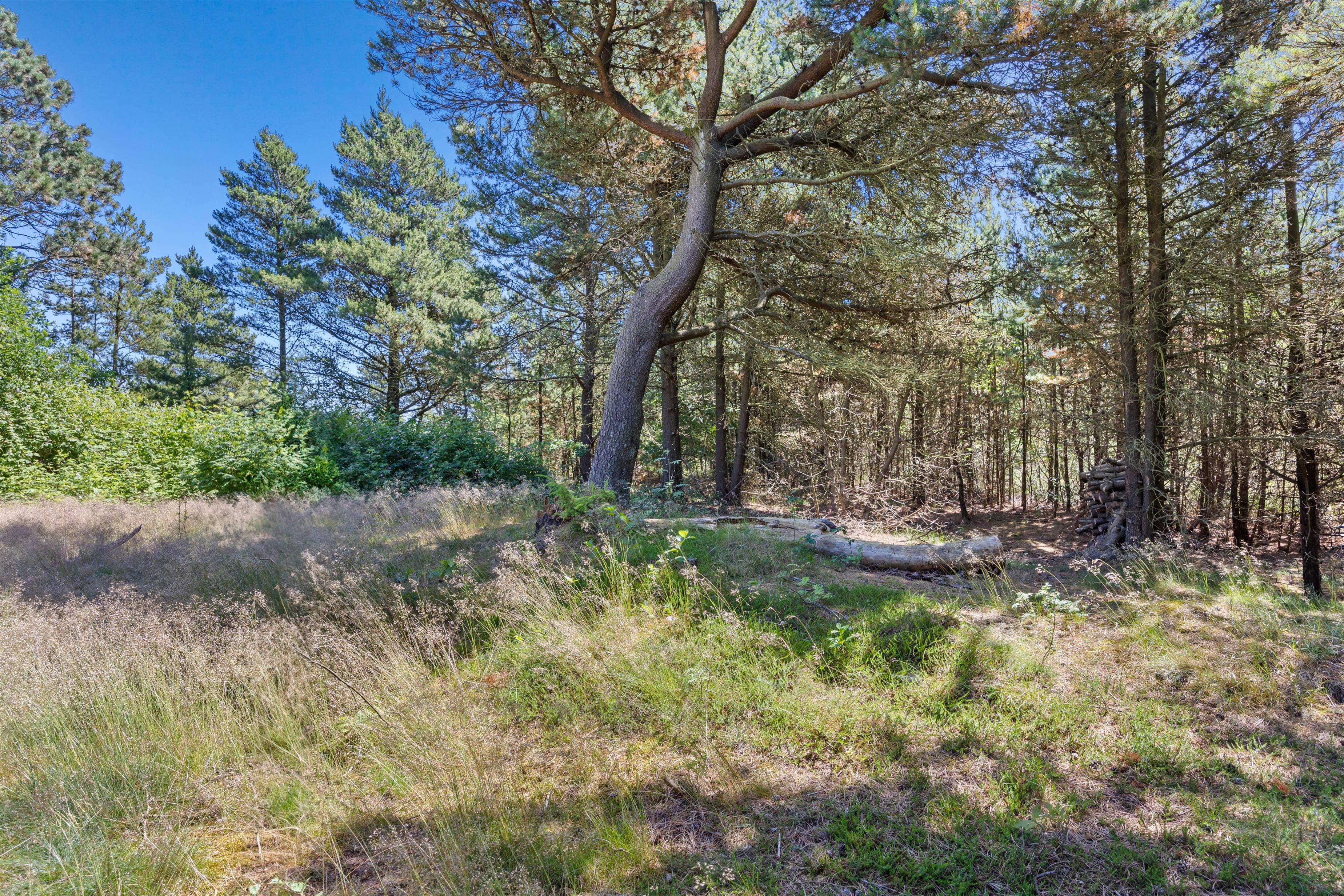 Det charmerende sommerhus ligger på en stor naturgrund, som er omgivet af buske og træer. Det giver et naturligt privatliv og vindbeskyttelse, så I kan opholde jer ugenert på terrassen. Om aftenen kan I tænde op i grillen til et lækkert grillmåltid og lade dagen gå på hæld i hyggeligt samvær.