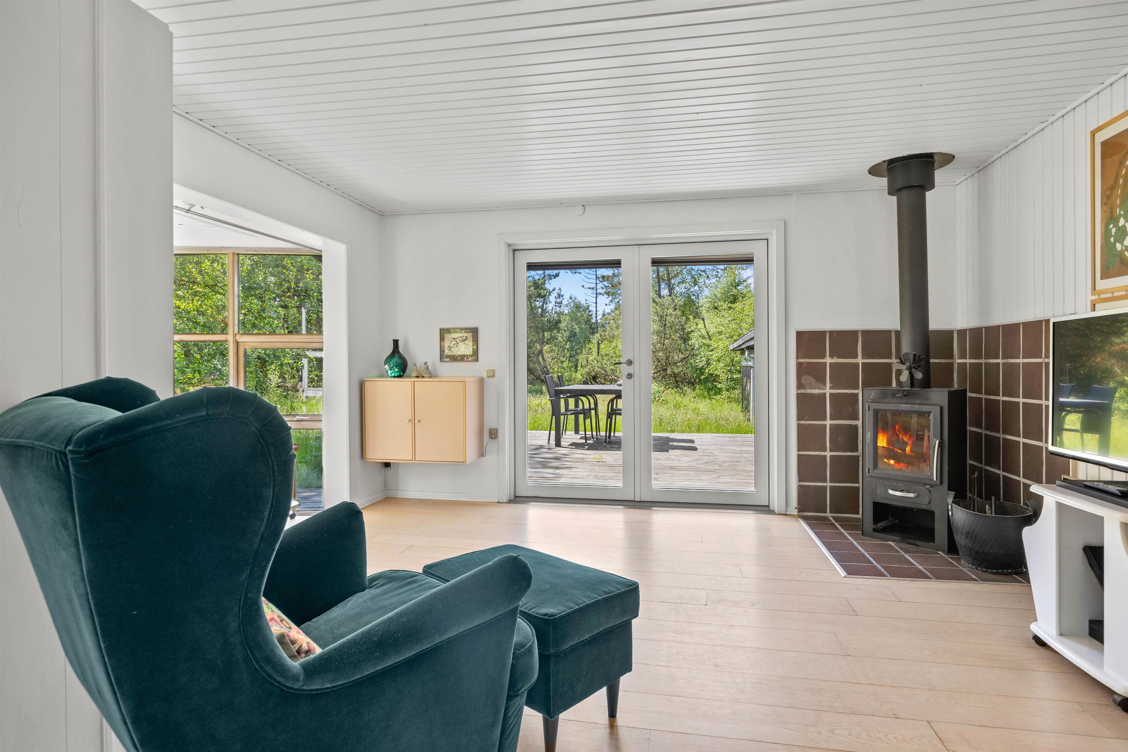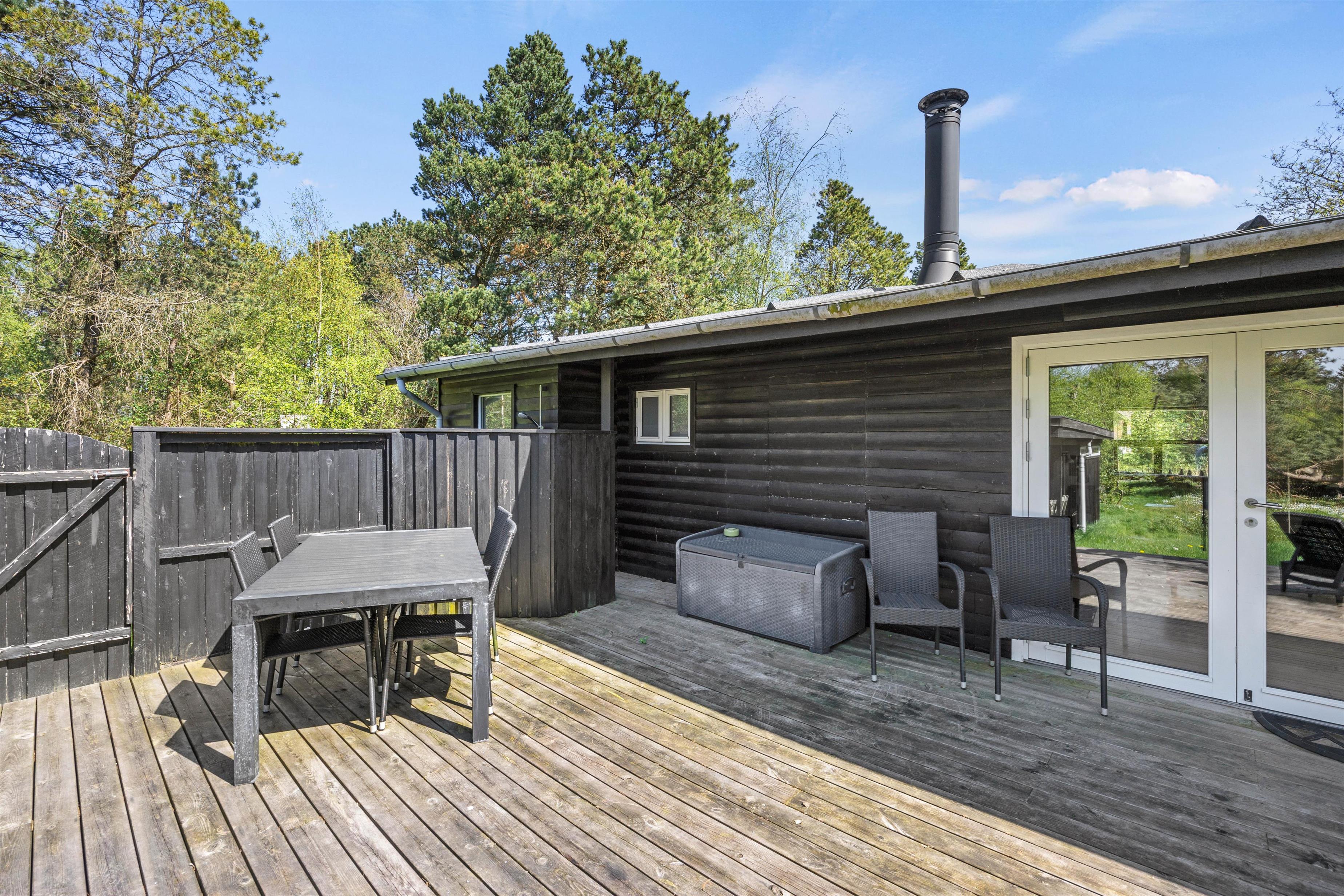 Dit charmerende sommerhus ligger på en 2.800 m² stor naturgrund, som er omgivet af buske og træer. Det giver dig et naturligt privatliv og vindbeskyttelse, så du kan opholde dig ugenert på den store træterrasse. En del af terrassen er overdækket, så du kan nyde den friske havluft, uanset vejret. Om aftenen kan I tænde op i grillen til et lækkert grillmåltid og lade dagen gå på hæld i hyggeligt samvær.