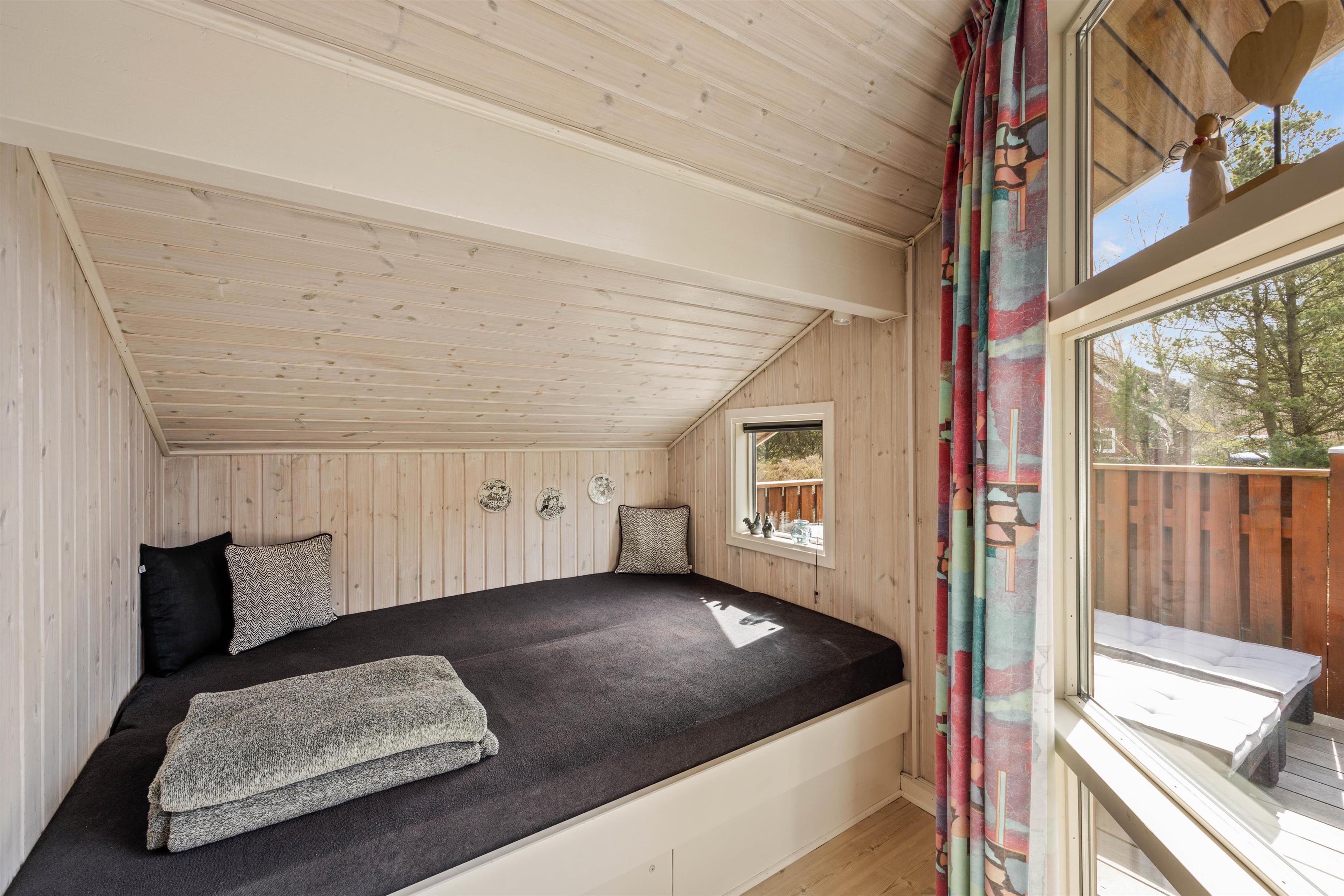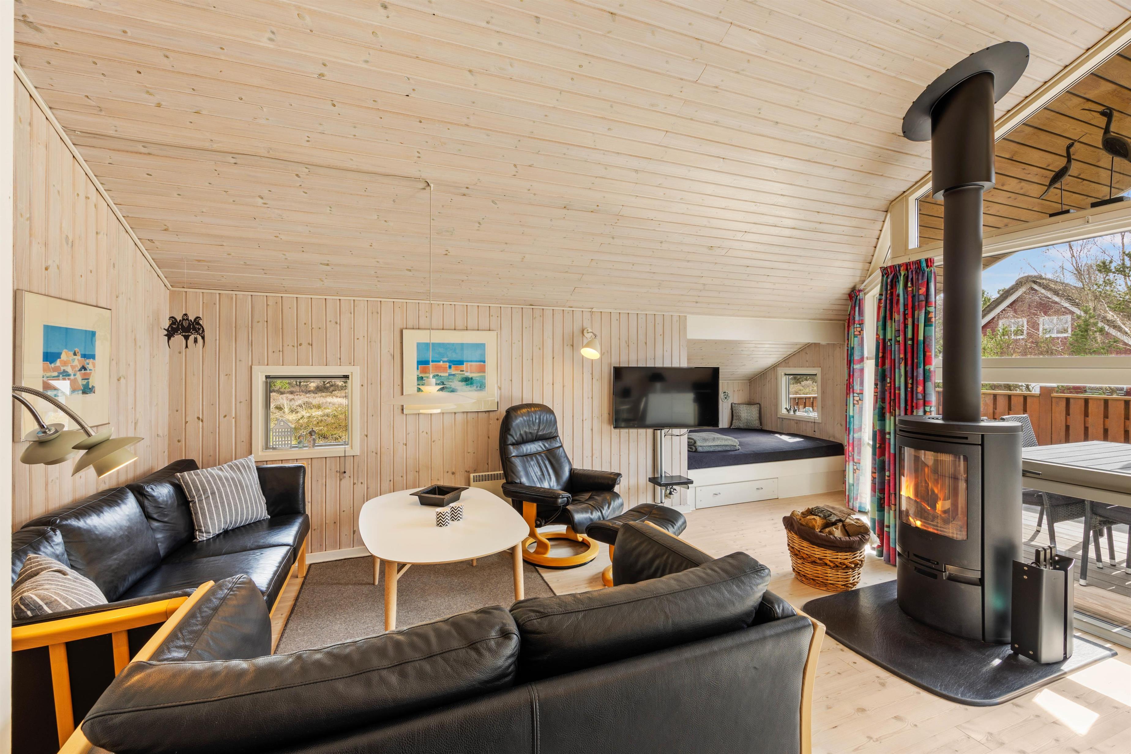 Det lille køkken, med gulvvarme, er åbent i forbindelse med spiseplads og sofagruppe. Her er alt, hvad I behøver for at tilberede lækre måltider, hygge jer foran brændeovnen ved spisebordet eller i sofaen med en god bog og en kop kaffe. Her er endda en alkove, hvis du får brug for et hvil midt på dagen. Sommerhusets mange vinkler og kroge i sammensætning med de lyse, træbeklædte vægge og lofter op i kip giver luft, hygge og feriestemning. På kølige dage eller mørke aftener er det nærliggende at tænde op i brændeovnen, lægge fødderne op og hygge sig sammen om et spil yatzy og et glas vin.