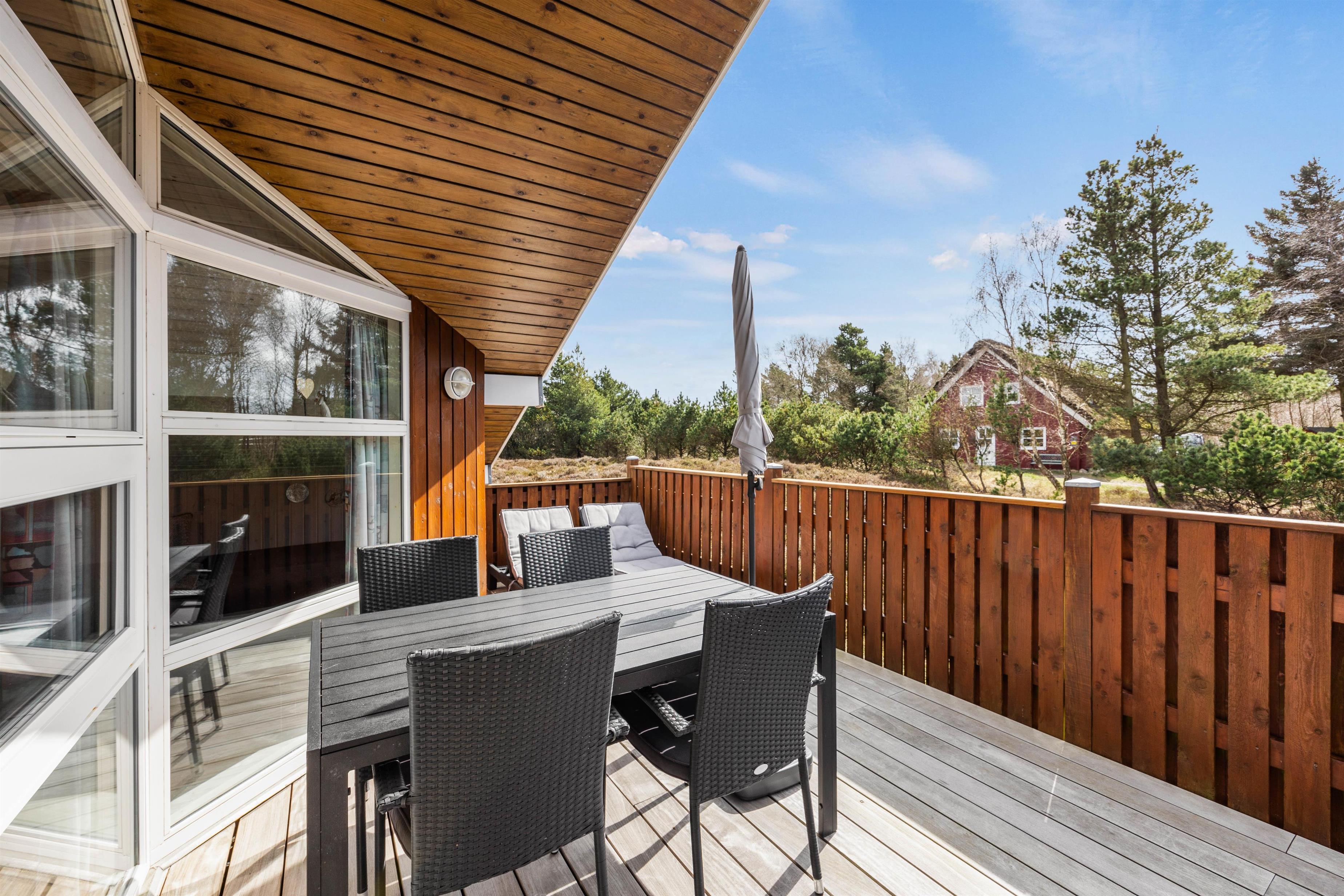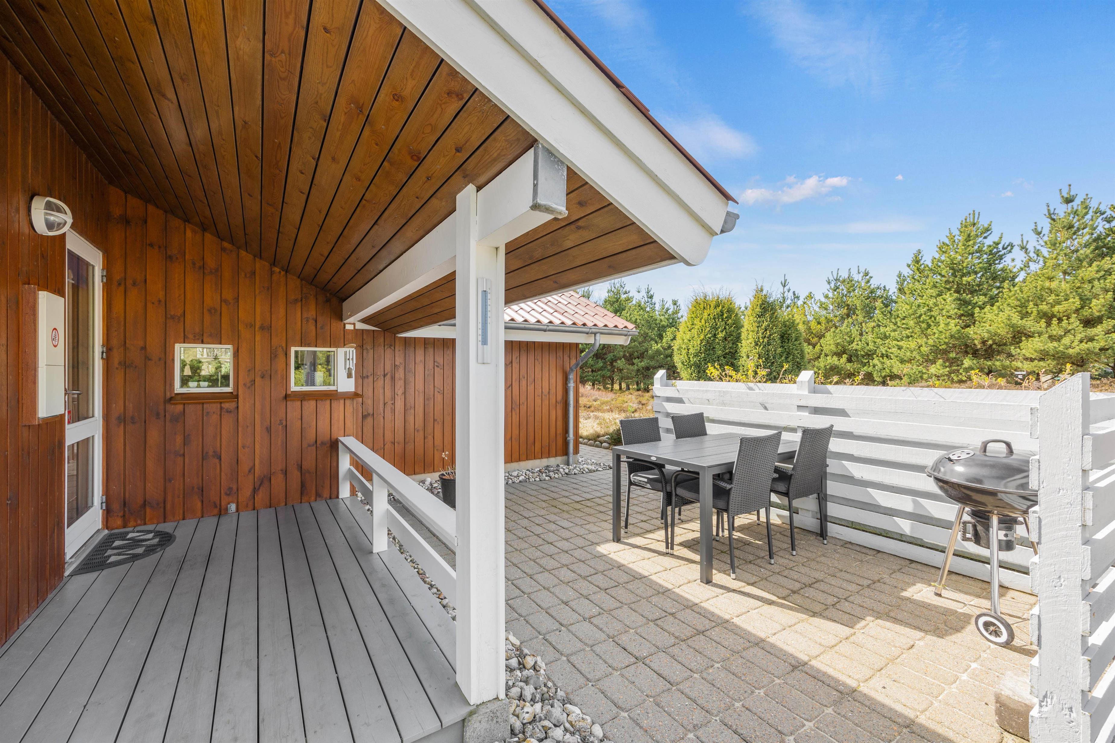 Den delvist overdækkede terrasse indbyder til mange timer i den friske luft. Her kan I altid finde et solrigt eller, hvis det er nødvendigt, et beskyttet og skyggefuldt sted at trække jer tilbage og slappe af i fred.