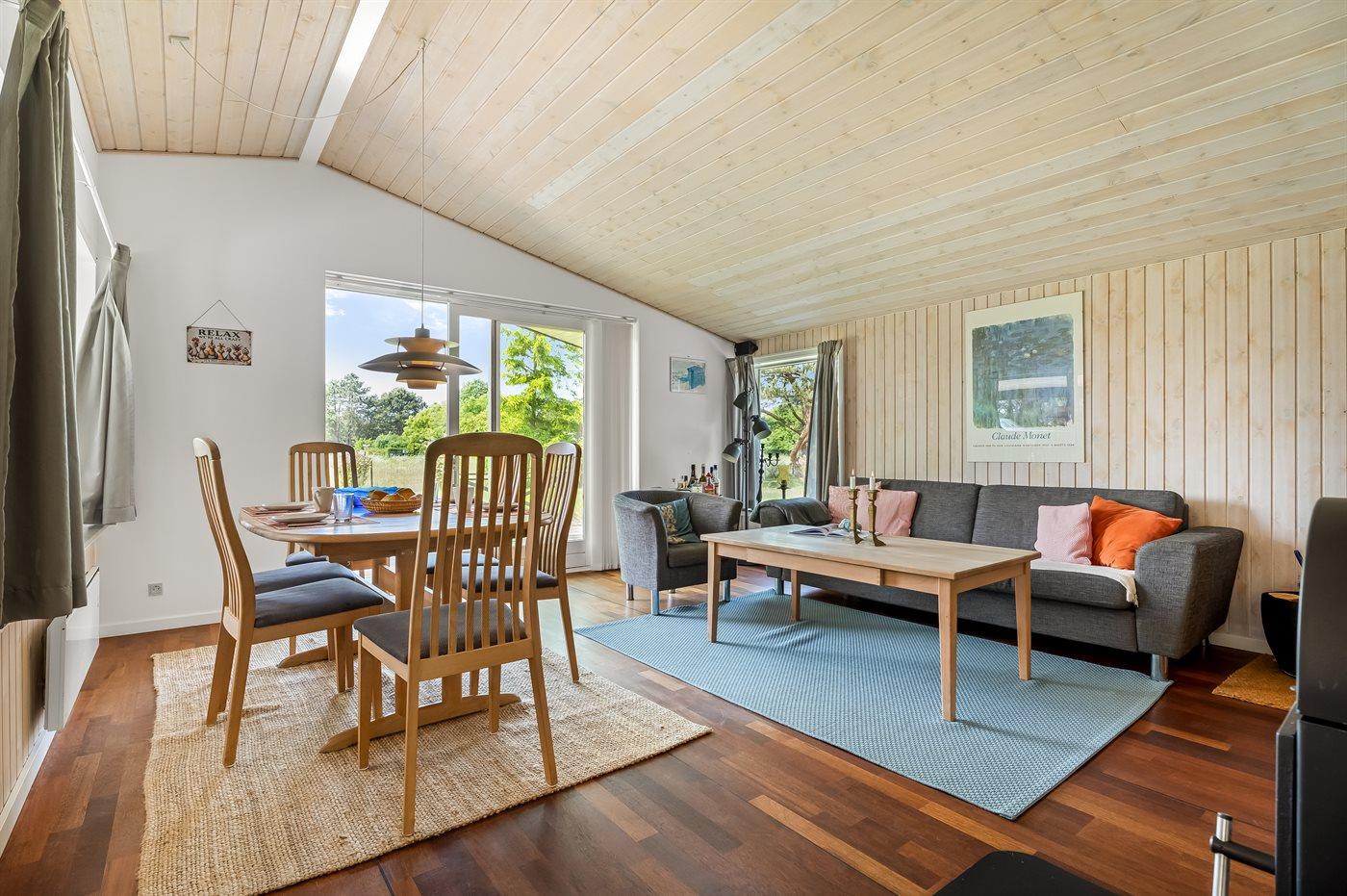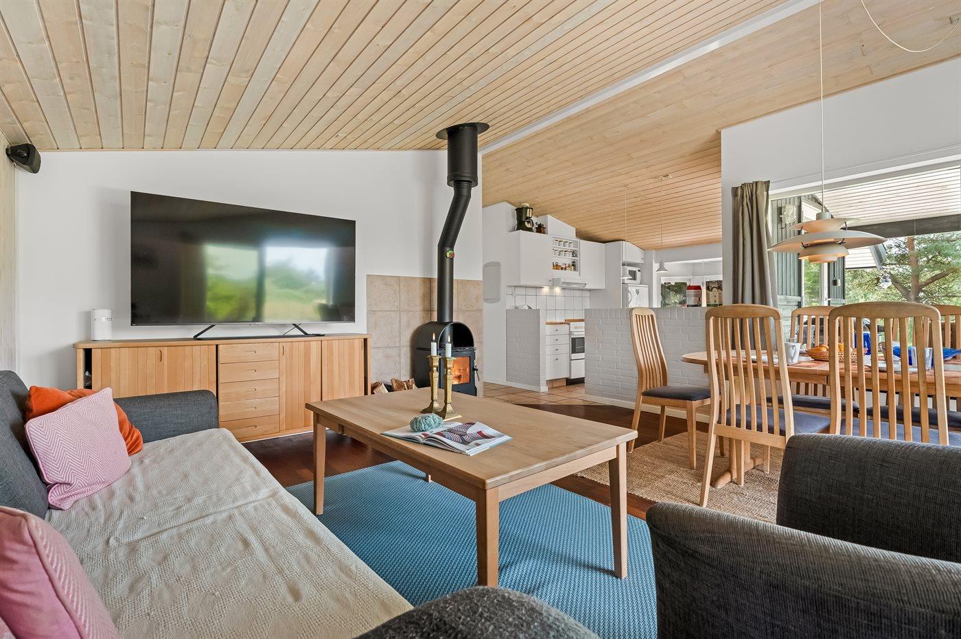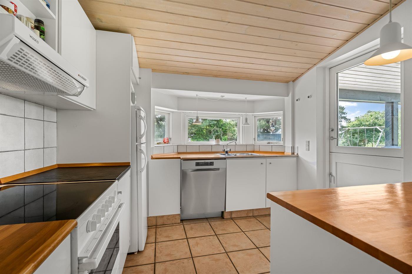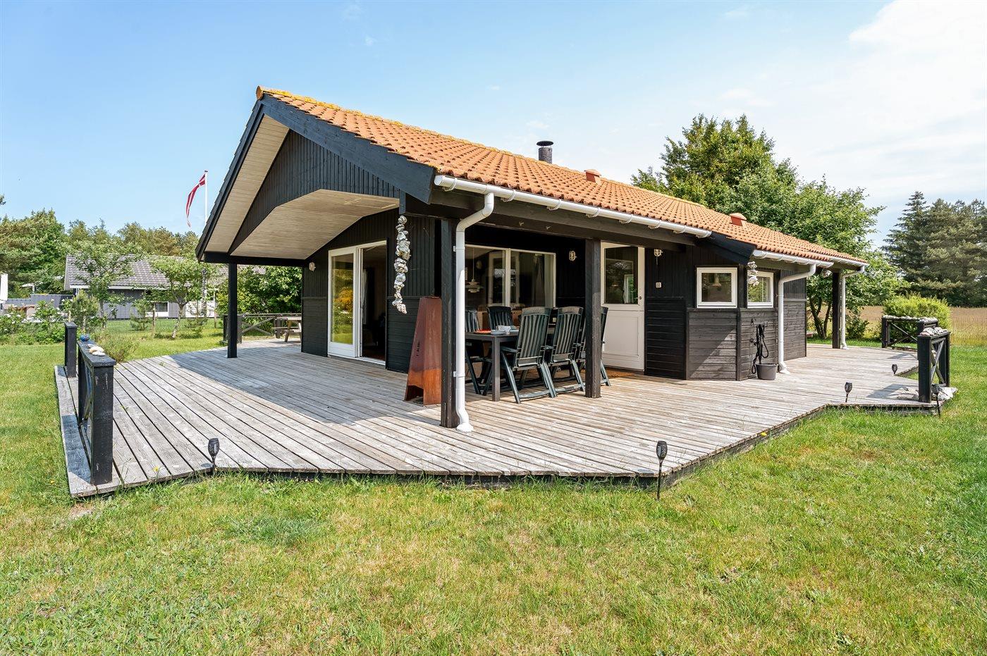 Dejligt sommerhus i træ, bygget i 2004, beliggende kun 150 m fra havet på en indhegnet naturgrund med beplantning. Til huset hører stor åben terrasse og 2 overdækkede terrasser med diverse havemøbler. Indvendig er der dels trævægge, dels malede vægge samt trælofter. Trægulve, dog klinker i badeværelse og gang. Dejligt badeværelse med gulvvarme, bruseniche og vaskemaskine. Det åbne køkken har gulvvarme og er udstyret med bl.a. opvaskemaskine, mikrobølgeovn og komfur med keramiske kogeplader. Skøn opholdsstue med brændeovn, DVD-afspiller, TV og stereoanlæg med CD-afspiller. Sovepladserne er fordelt på 1 værelse med dobbeltseng og 1 med 2 køjesenge. Desuden anneks med 2 enkeltsenge og lille tekøkken. Til de små feriegæster er der høj barnestol til rådighed.