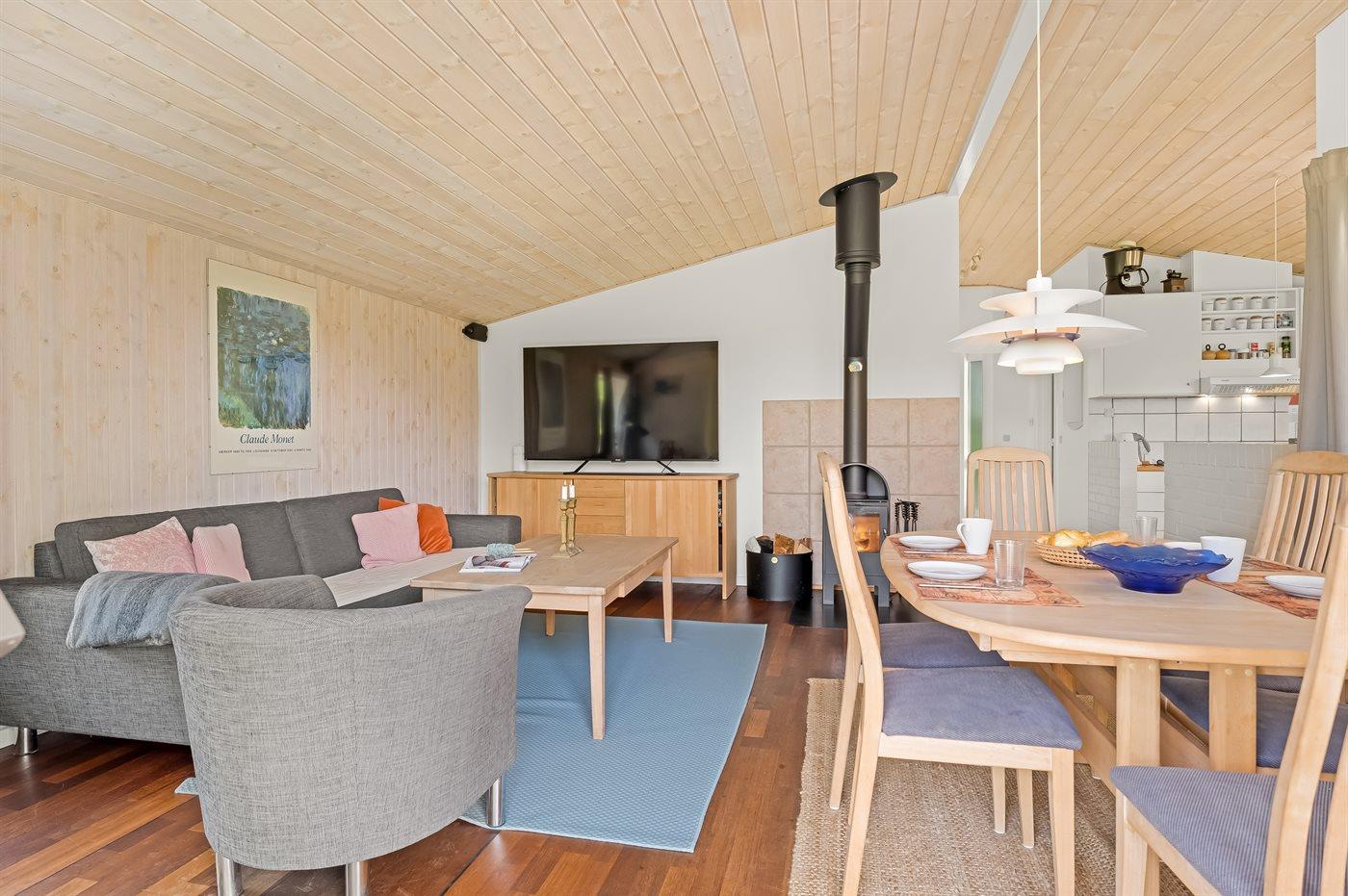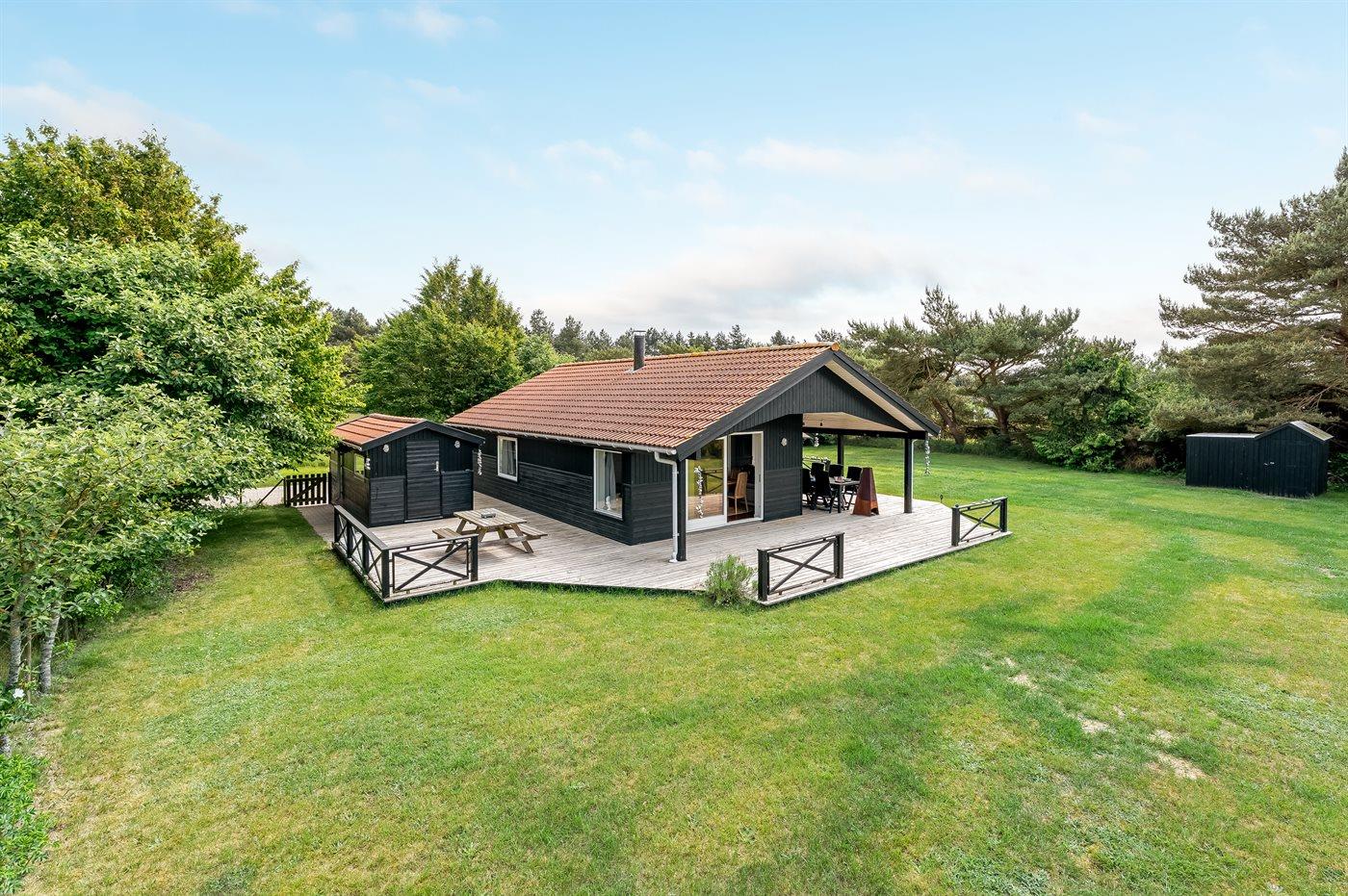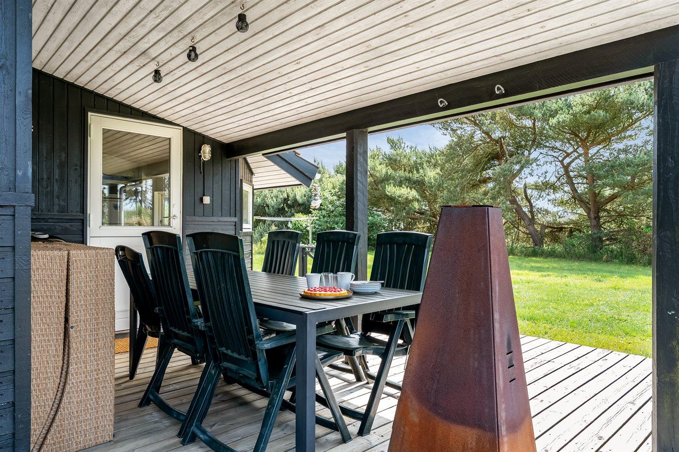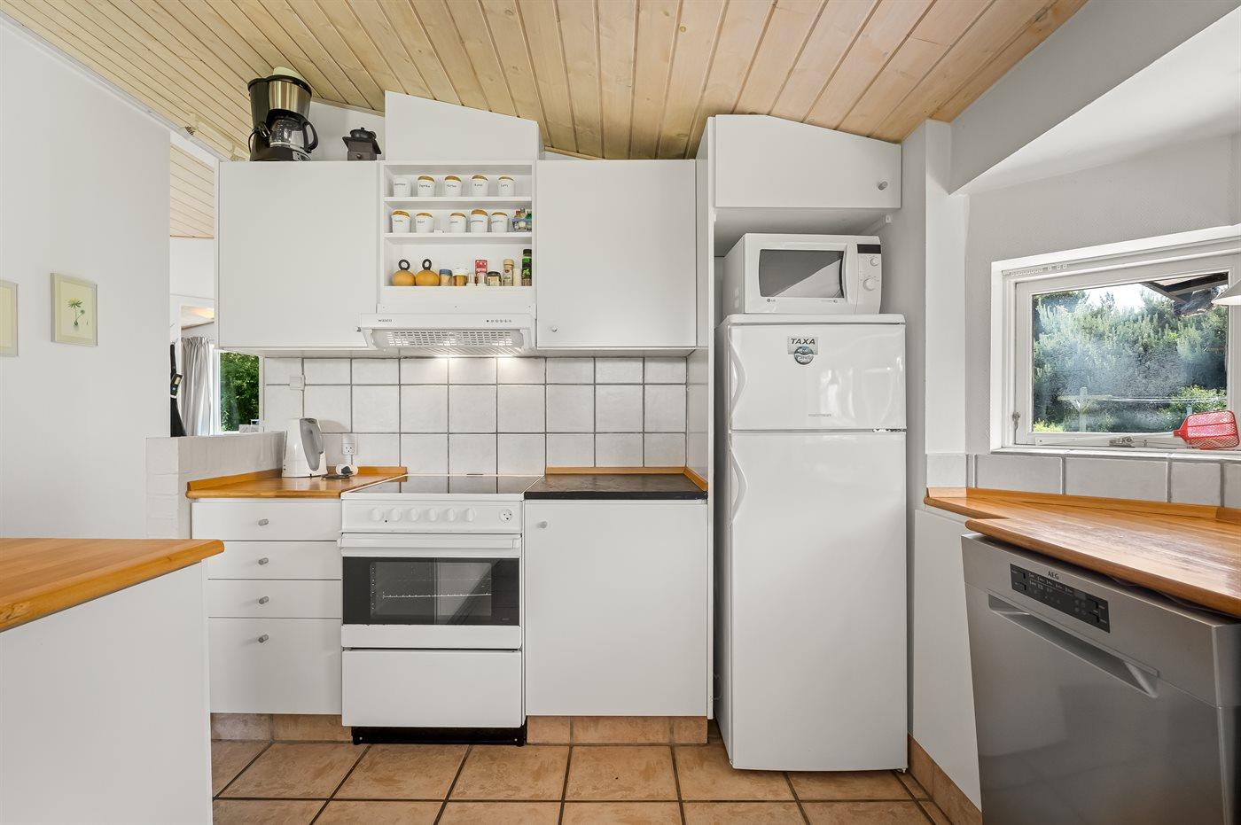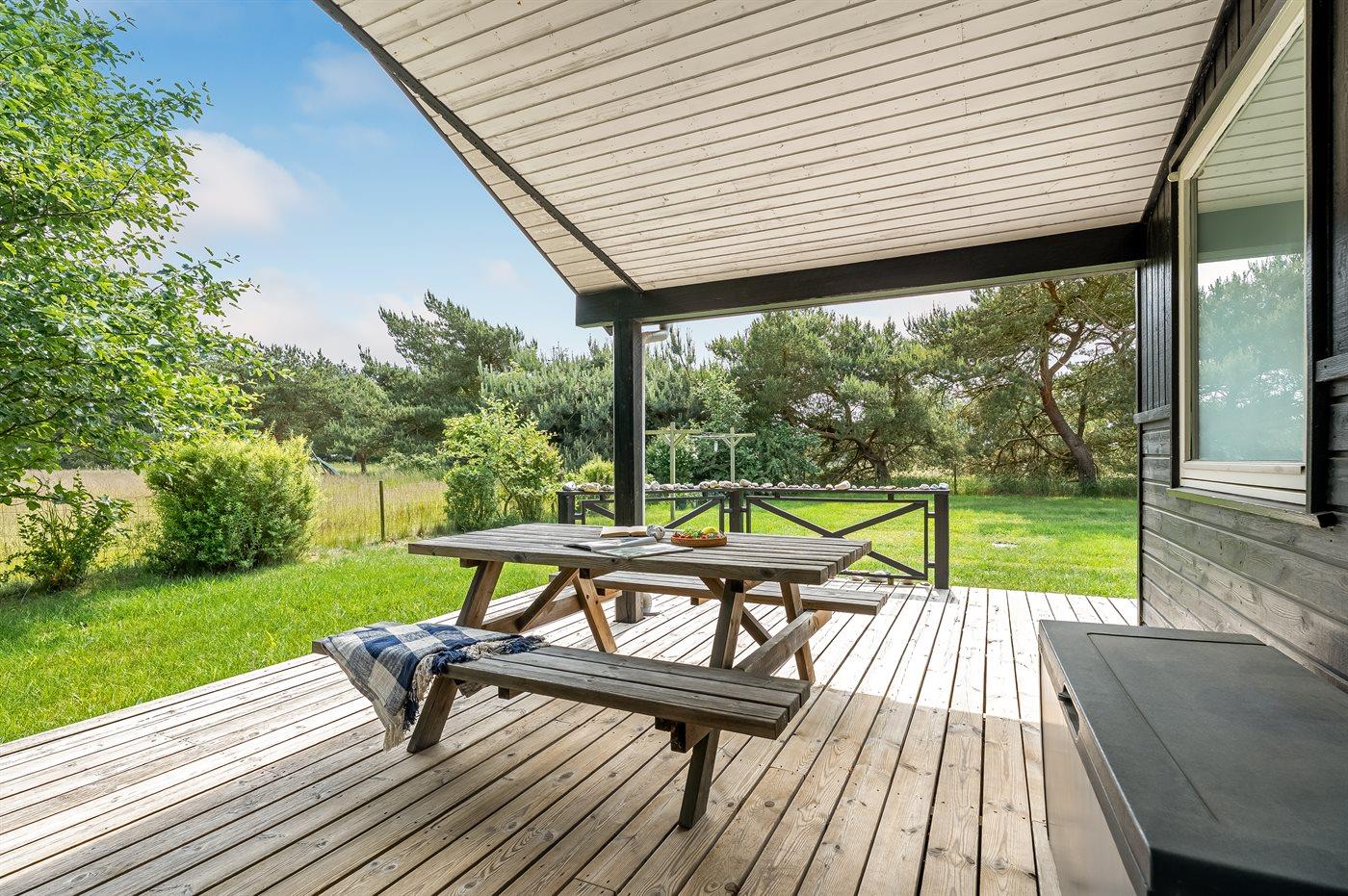Dejligt sommerhus i træ, bygget i 2004, beliggende kun 150 m fra havet på en indhegnet naturgrund med beplantning. Til huset hører stor åben terrasse og 2 overdækkede terrasser med diverse havemøbler. Indvendig er der dels trævægge, dels malede vægge samt trælofter. Trægulve, dog klinker i badeværelse og gang. Dejligt badeværelse med gulvvarme, bruseniche og vaskemaskine. Det åbne køkken har gulvvarme og er udstyret med bl.a. opvaskemaskine, mikrobølgeovn og komfur med keramiske kogeplader. Skøn opholdsstue med brændeovn, DVD-afspiller, TV og stereoanlæg med CD-afspiller. Sovepladserne er fordelt på 1 værelse med dobbeltseng og 1 med 2 køjesenge. Desuden anneks med 2 enkeltsenge og lille tekøkken. Til de små feriegæster er der høj barnestol til rådighed.