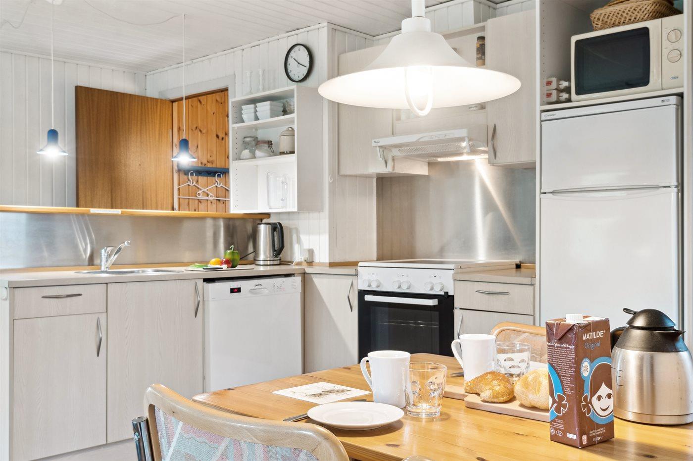 Køkkenet er udstyret med 1 køleskab. Der er 4 keramiske kogeplader, bageovn, mikrobølgeovn samt opvaskemaskine.