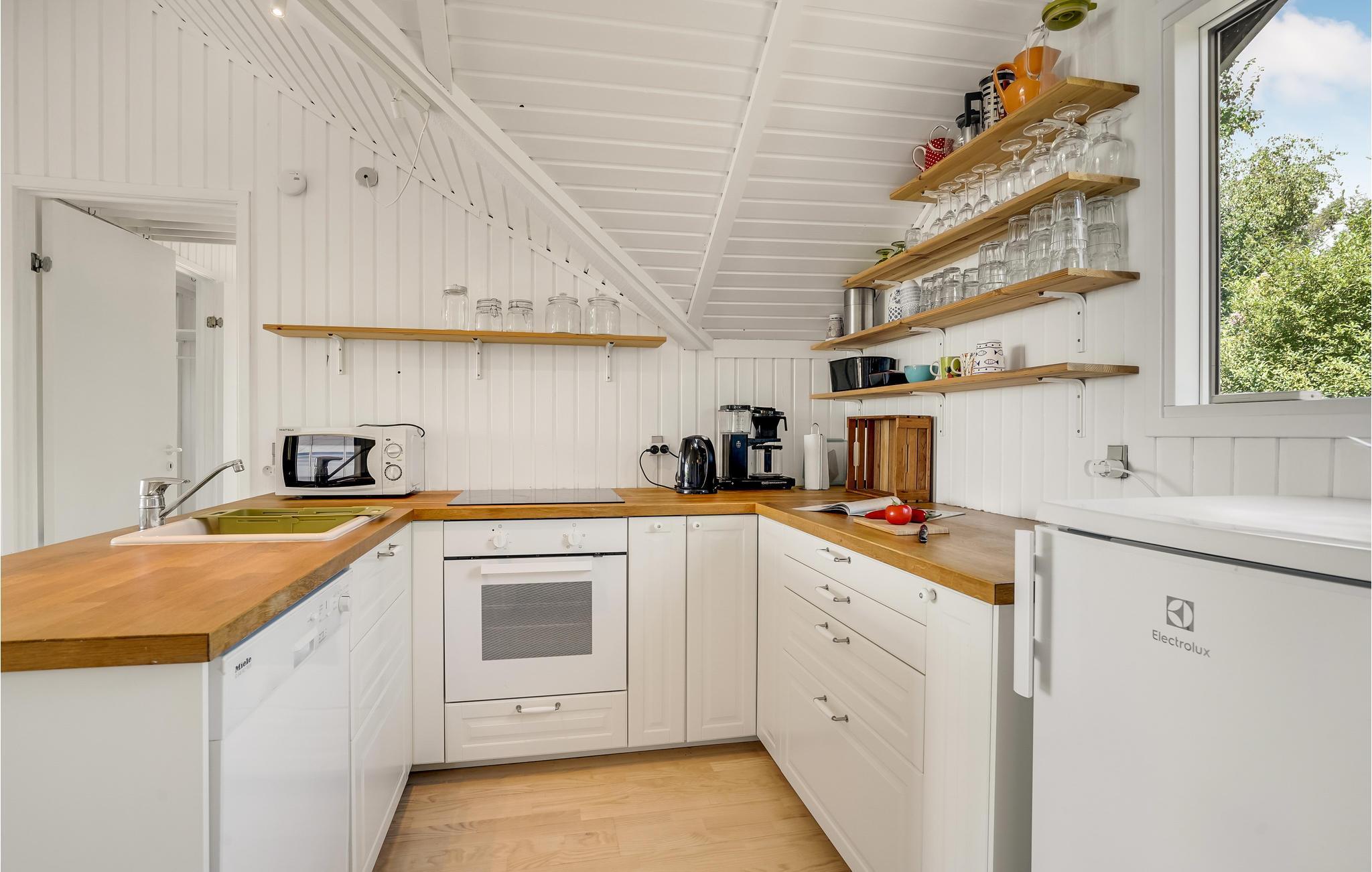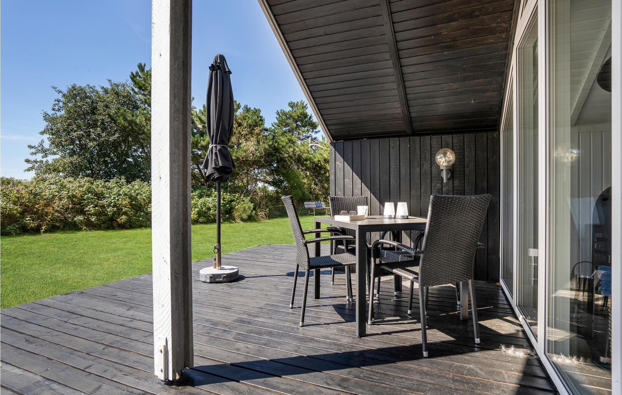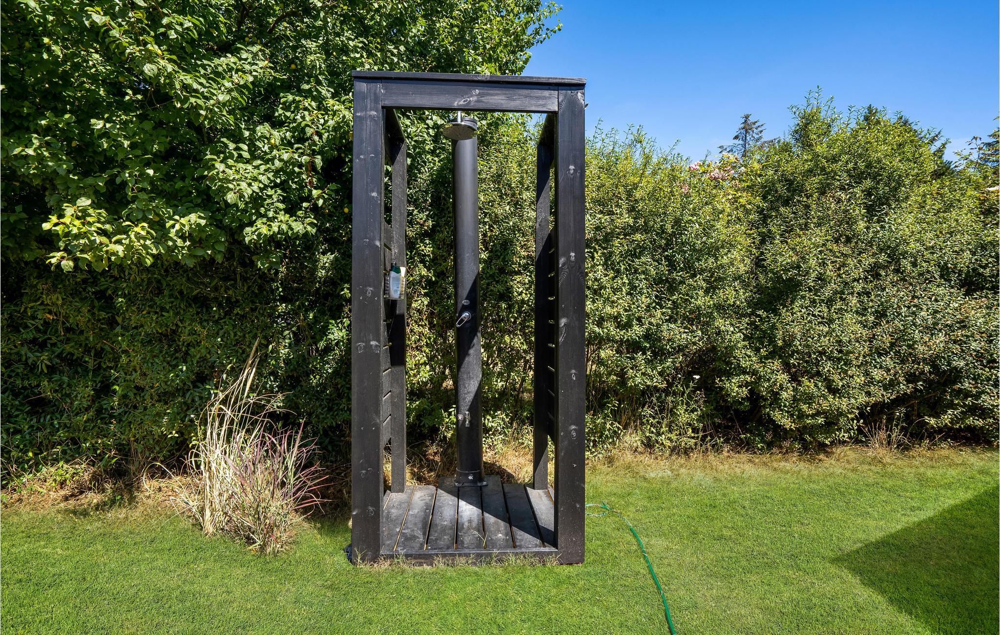 Fra stuen kommer man ud på den overdækkede terrasse med havemøbler og grill til afslappende eftermiddage og hyggelige sommeraftener. I haven er der masser af plads til sjov og leg, og der er også en udendørs bruser til de varme sommerdage eller til at skylle saltvandet af efter en dukkert.
