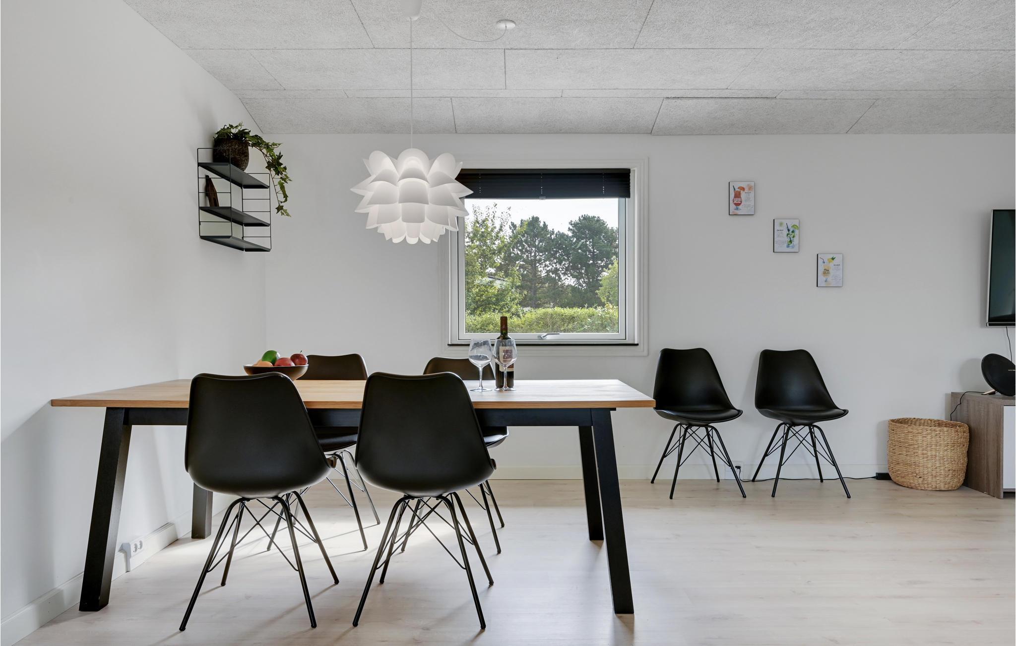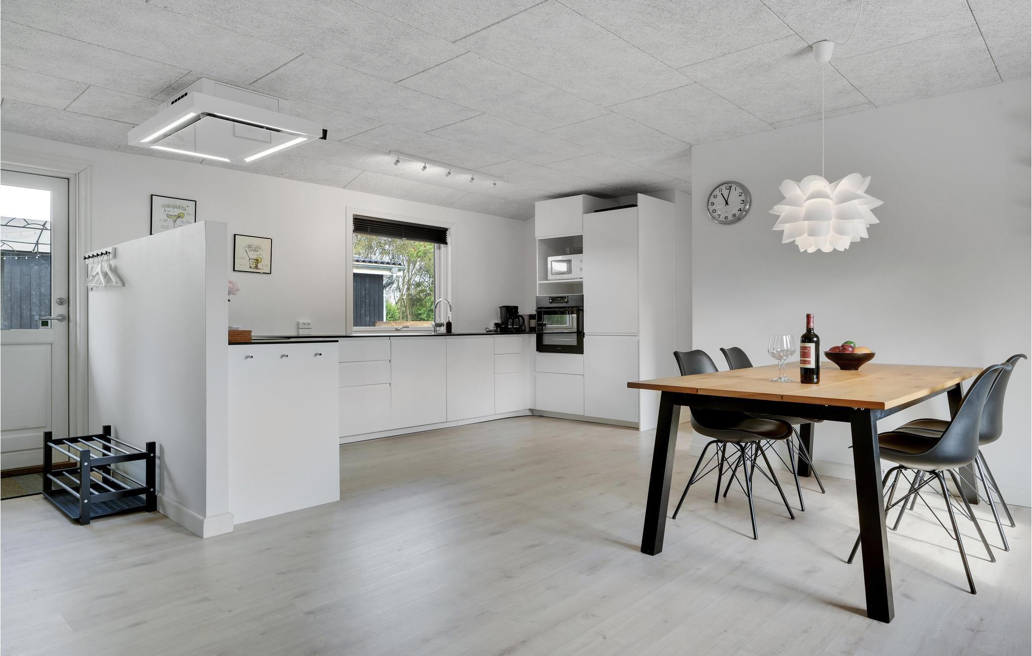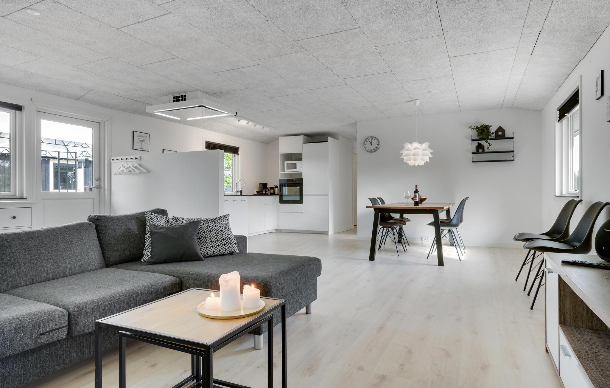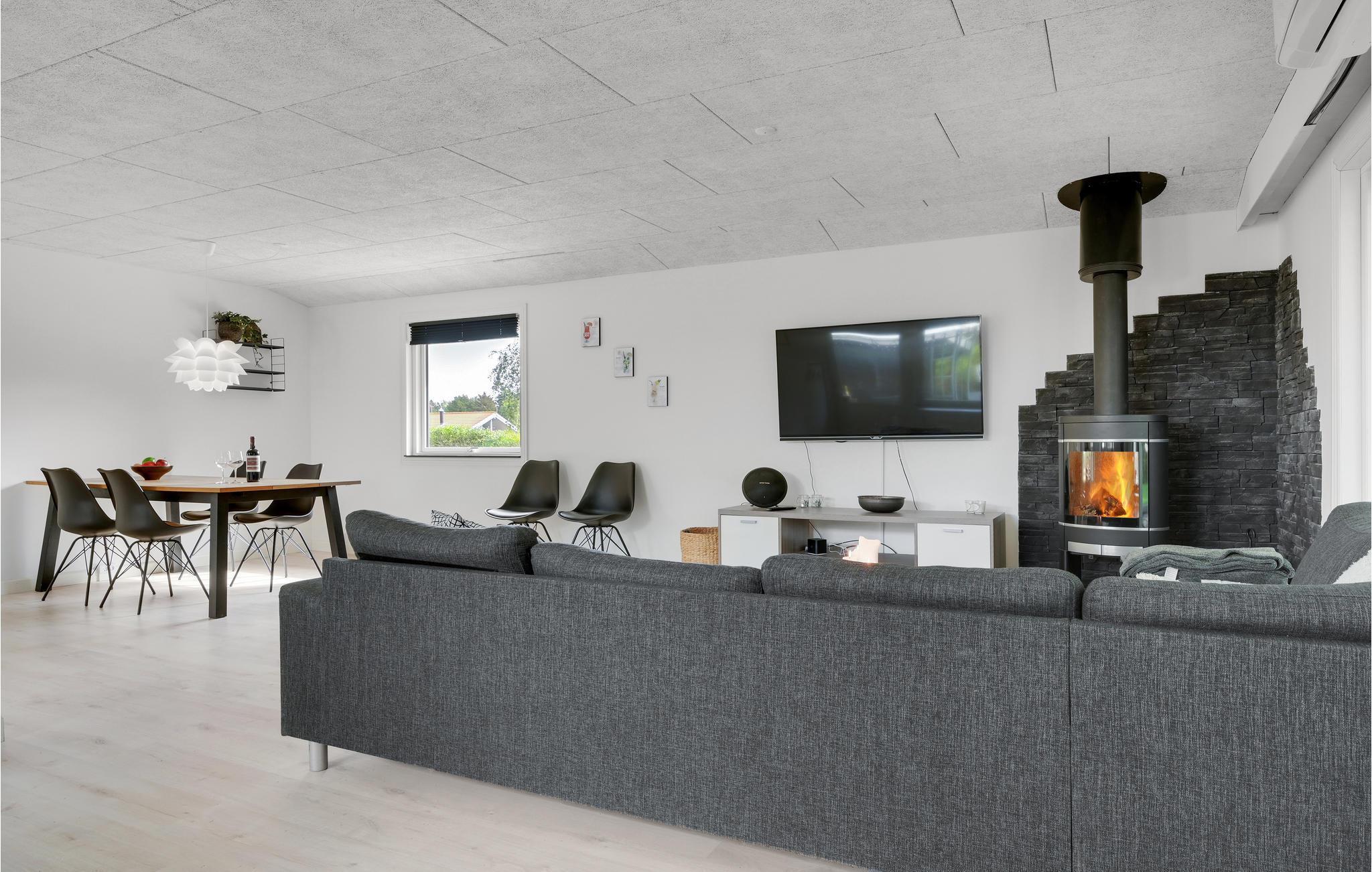 Indretninger er lys, moderne og ikke mindst rummelig, og hele familien kan slænge sig i den store sofa, der er centreret omkring brændeovnen samt det store fjernsyn. Udendørs finder I en skøn træterrasse med spiseplads og solvogne, så sommerkuløren kan komme på plads.