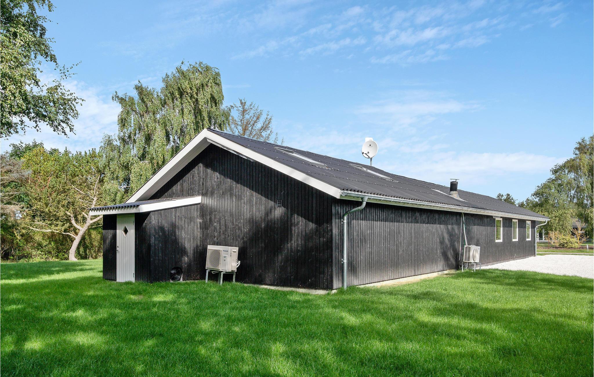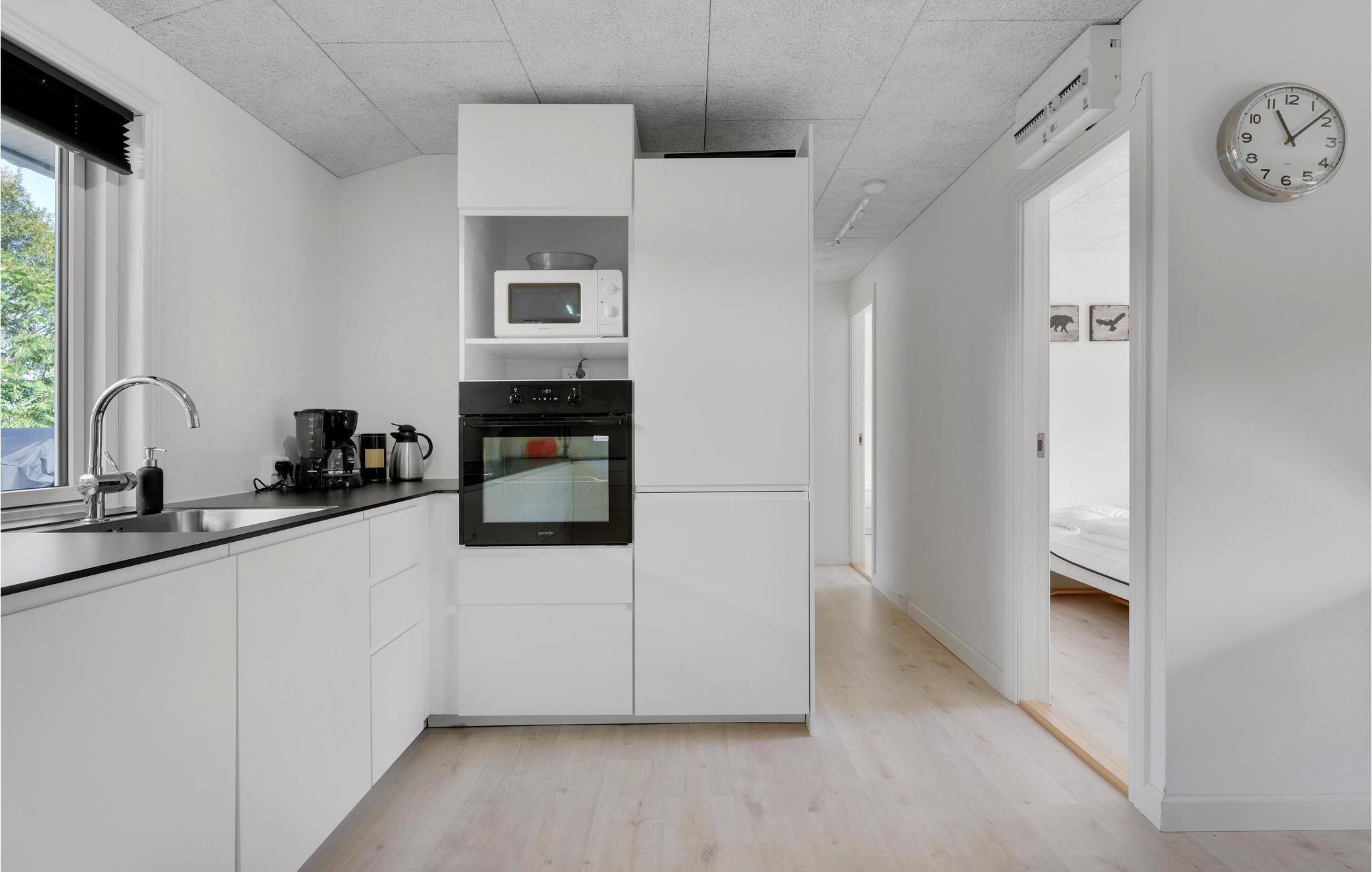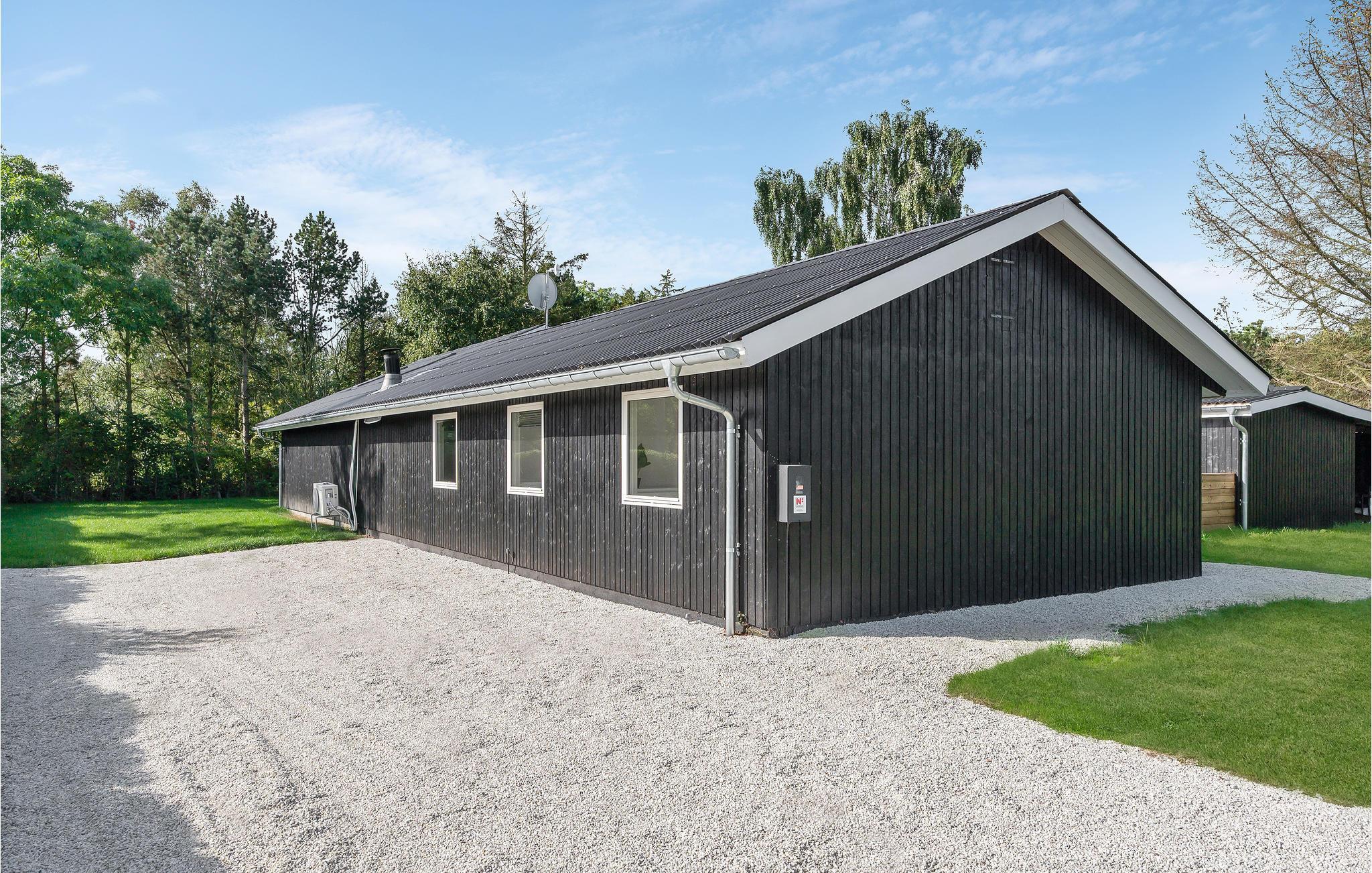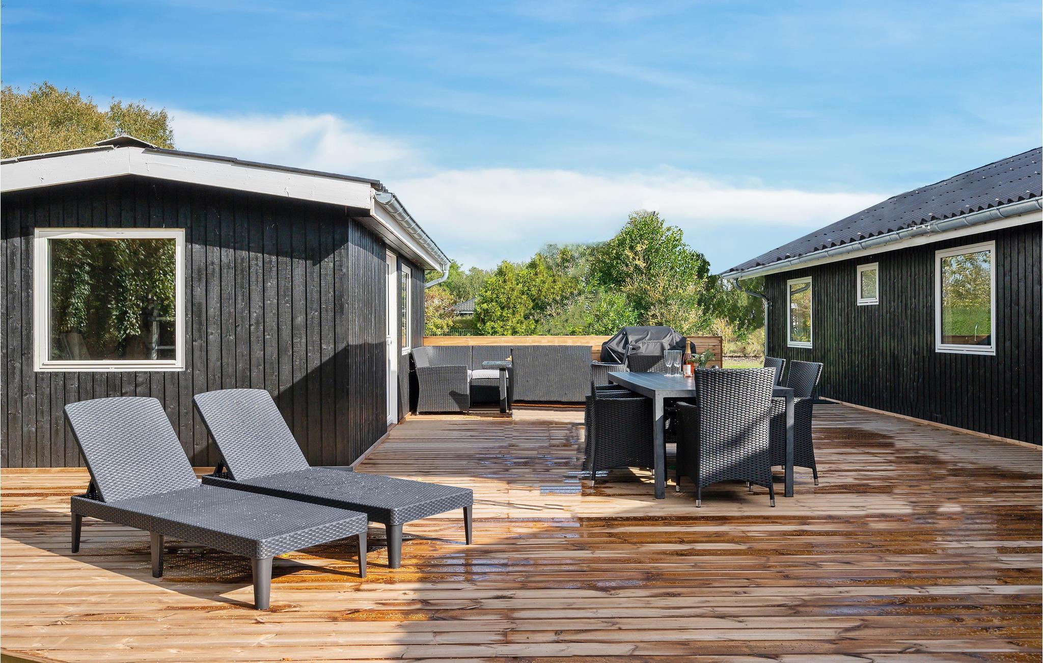 Indretninger er lys, moderne og ikke mindst rummelig, og hele familien kan slænge sig i den store sofa, der er centreret omkring brændeovnen samt det store fjernsyn. Udendørs finder I en skøn træterrasse med spiseplads og solvogne, så sommerkuløren kan komme på plads.