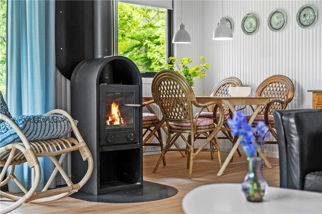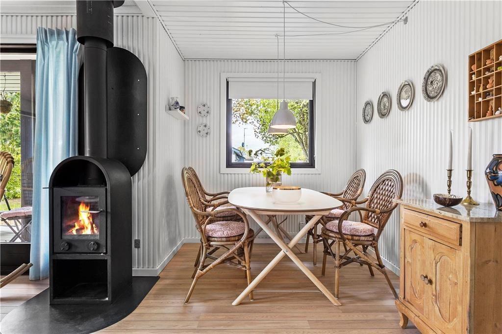 I stuen er der spiseplads og hyggelig sofagruppe til familien, hvor der kan spilles brætspil og hygges ved brændeovnen på de kølige dage.