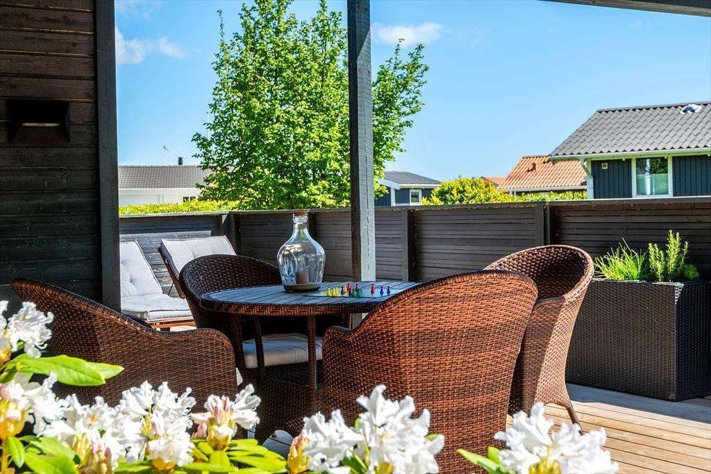 Udenfor venter en elegant terrasse, hvor du kan tilbringe mange timer med at nyde den friske luft og den stille atmosfære, som kendetegner dette område. Den overdækkede terrasse med komfortable møbler giver dig mulighed for at skabe uforglemmelige stunder med både morgenkaffe og middag i solnedgangen. Grillen og det smukke udendørsområde indbyder til middage under åben himmel, mens du måske hører fuglenes kvidren. I den velholdte have kan du finde både sol og skygge, og der er masser af plads til både at nyde den private ro og til at samle kræfter til de oplevelser, området byder på.
