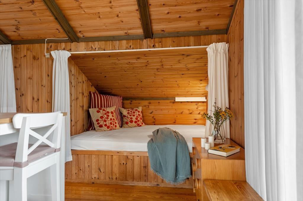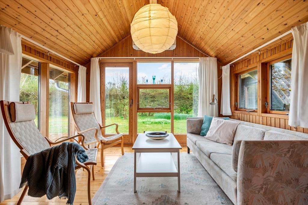 Husets indre byder på en autentisk og hjemlig atmosfære med klassiske sommerhusmaterialer og varme detaljer. I det åbne opholdsrum er der god plads til fællesstunder – her kan du samle familien til måltider omkring spisebordet, spille et brætspil eller blot nyde stilheden. I hjørnet står en alkove, der indbyder til stille stunder med en kop te og en god bog – eller måske en lur i skyggen midt på dagen.